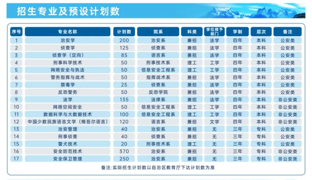本科公安专业:约635人,面向新疆及部分外省招生,分为公安学类(选科要求:政治)和公安技术类(选科要求:物理+化学)