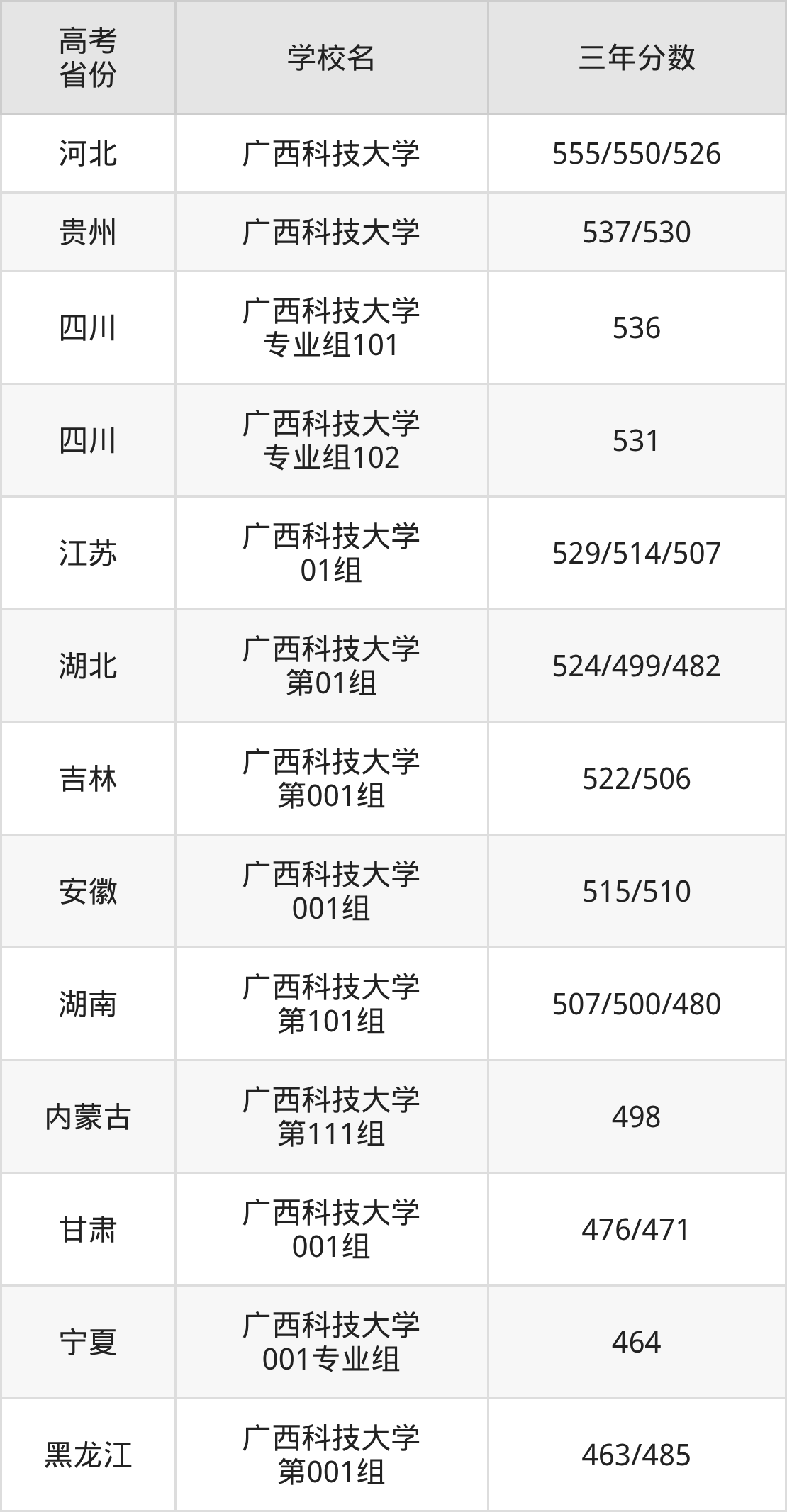 | 河北 | 广西科技大学 | 503/486/474 |