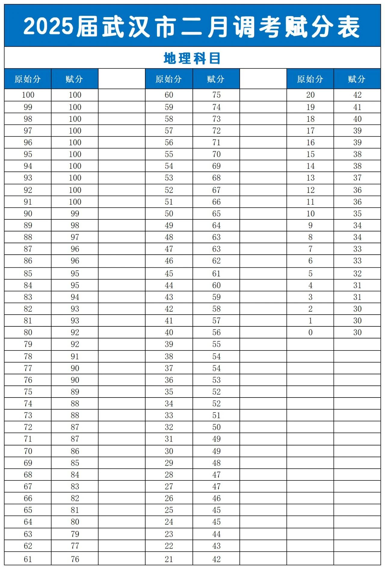 地理:原始分100→100分,60→75分,50→65分,40→56分,20→42分,0→30分;