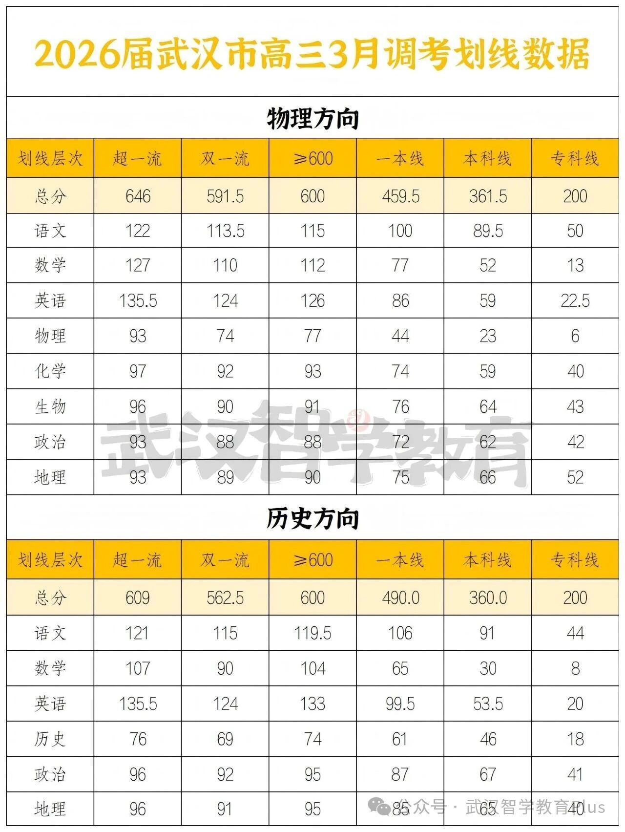 需要说明的是,武汉二调不仅是武汉全市高中高三考生参与,省内部分地市州学校也会同步参加,因此划线具有一定的代表性。以下是2026年武汉二调的官方划线数据: