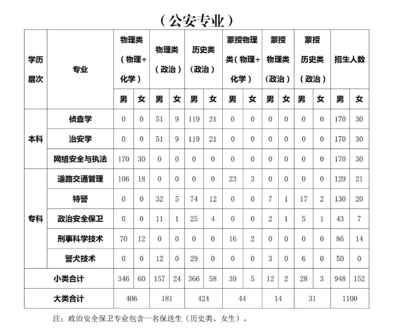 本科提前批:公安类专业(侦查学、治安学、网络安全与执法)及非公安专业(法学)。