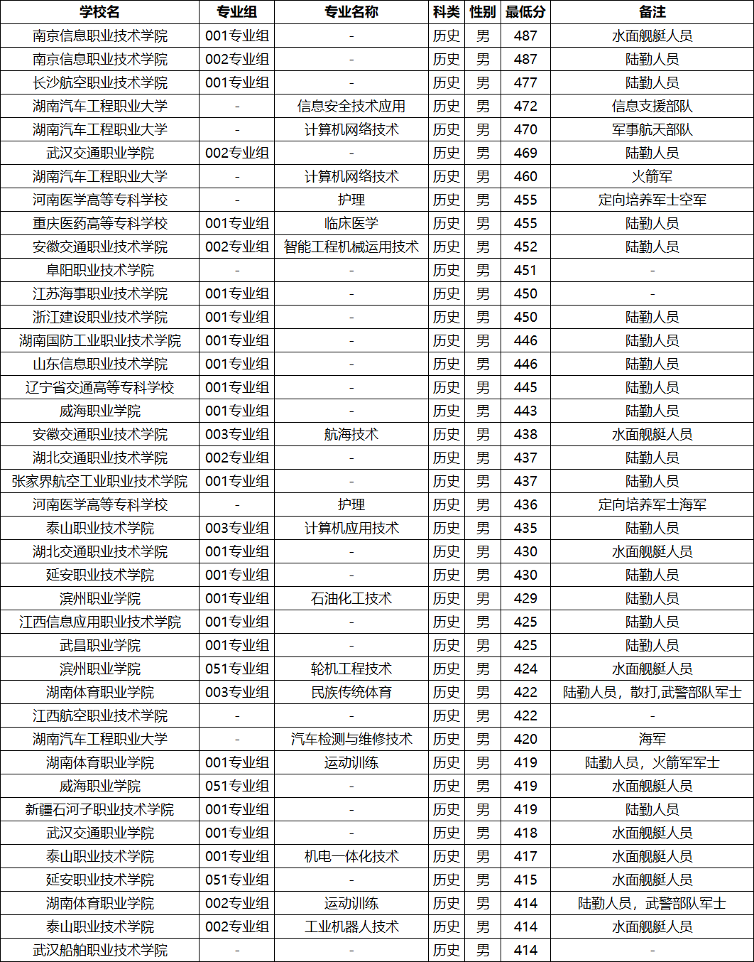 2025年录取分数线最低的定向培养军士院校有湖南体育职业学院、泰山职业技术学院、武汉船舶职业技术学院,投档最低分为414。