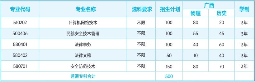 2、高职高专:计算机网络技术、民航安全技术管理、法律事务、法律文秘、安全防范技术。