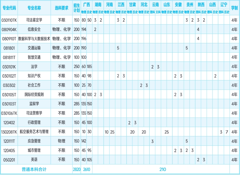 3、普通本科:司法鉴定学、信息安全、数据科学与大数据技术、交通运输、智慧交通、法学、知识产权、社会工作、国际经贸规则、监狱学、司法警察学、行政管理、航空服务艺术与管理、应急管理、城市管理、英语。