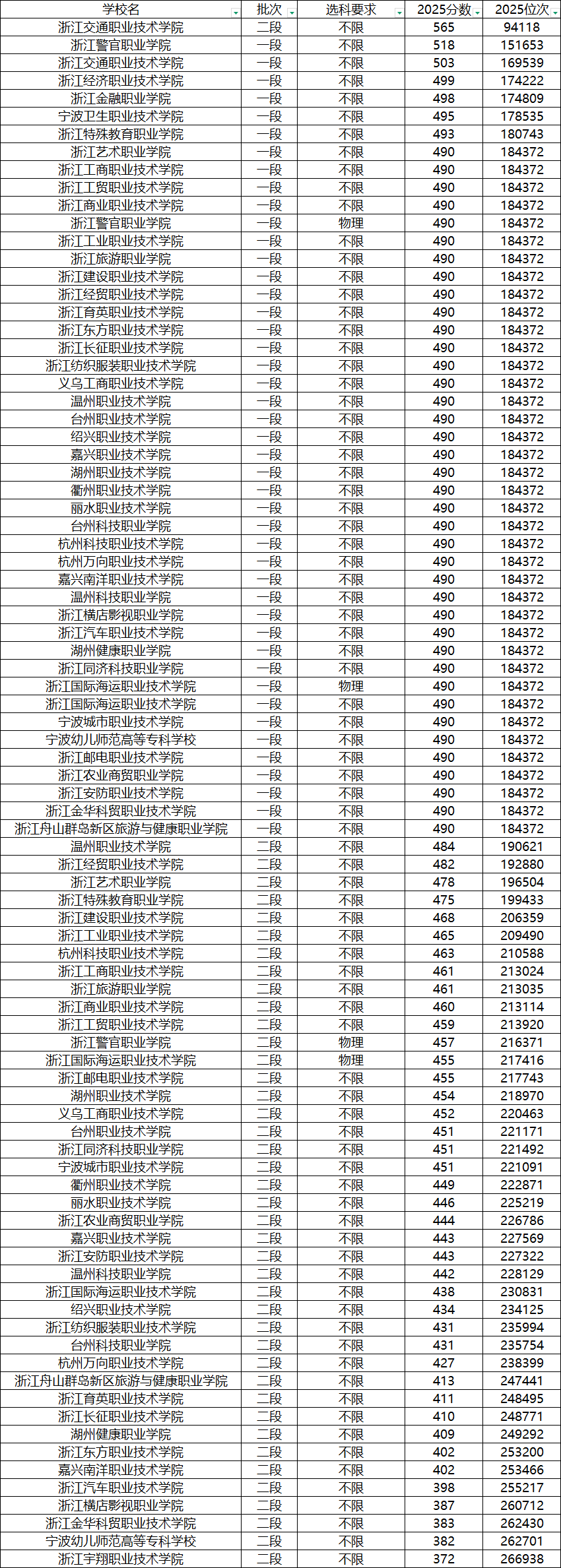 一、2025年全国专科院校在浙江录取分数线