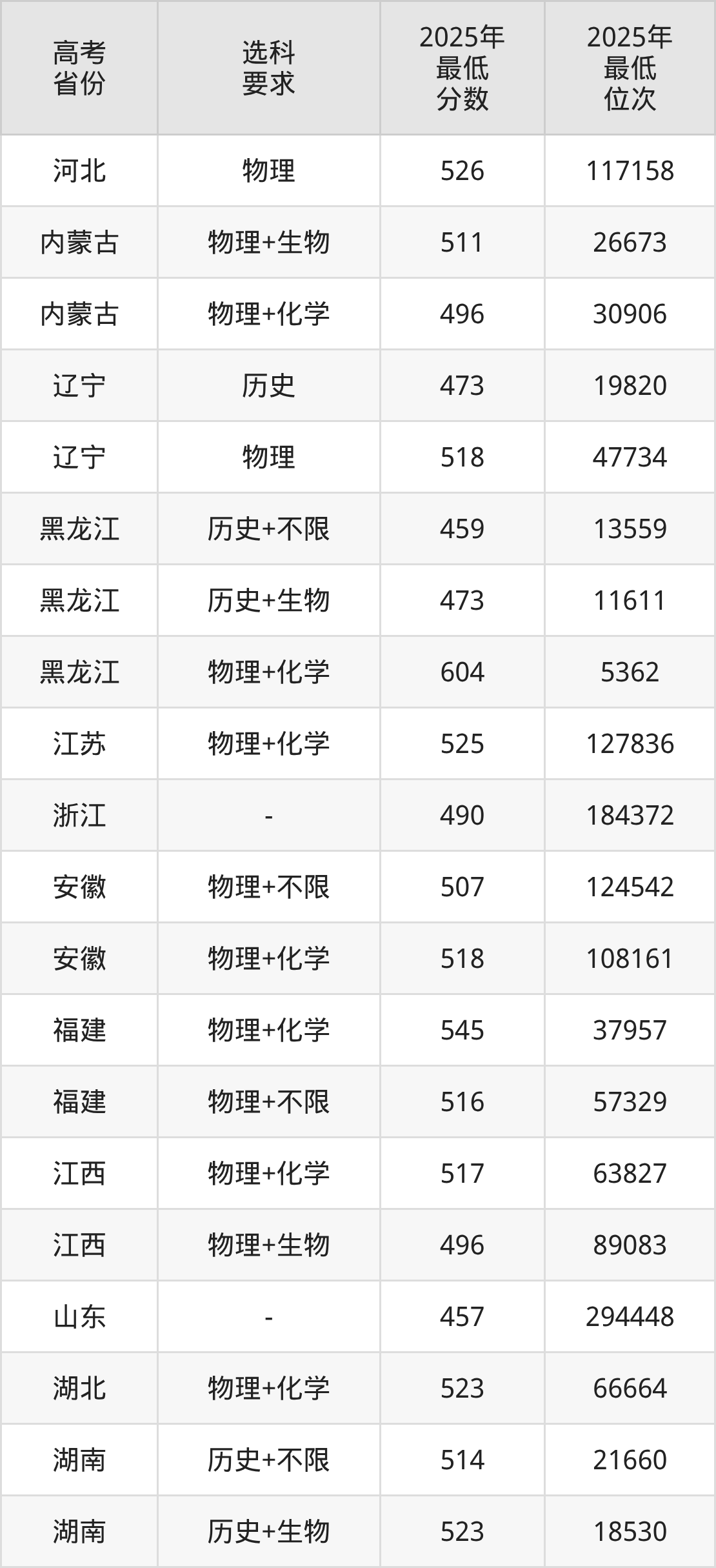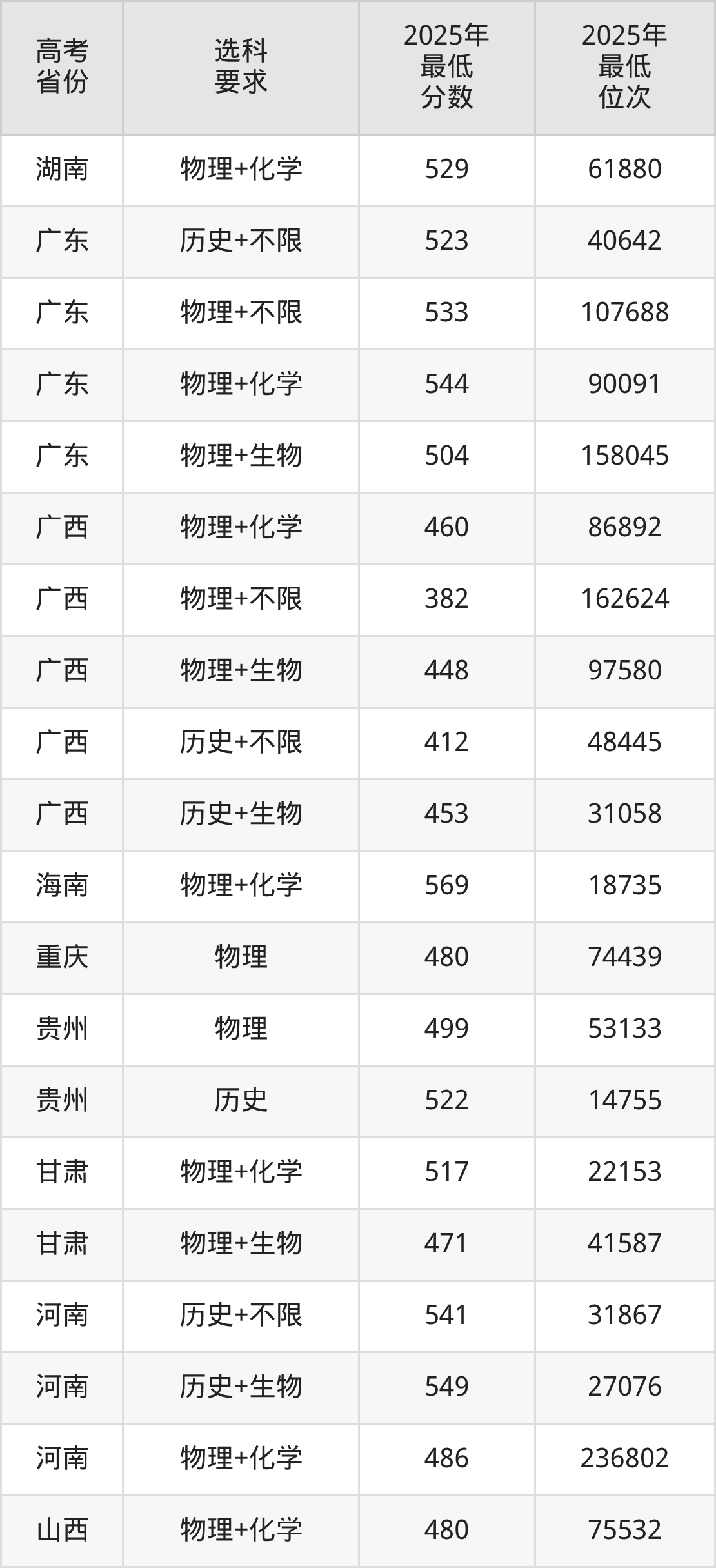在2025年广西高考物理类招生时,211收分最低的是东北农业大学104组,最低分是381分、位次是163558位。再看广西医科大学,2025年在广西物理类的最低录取分数线是382分,最低位次是162624位。