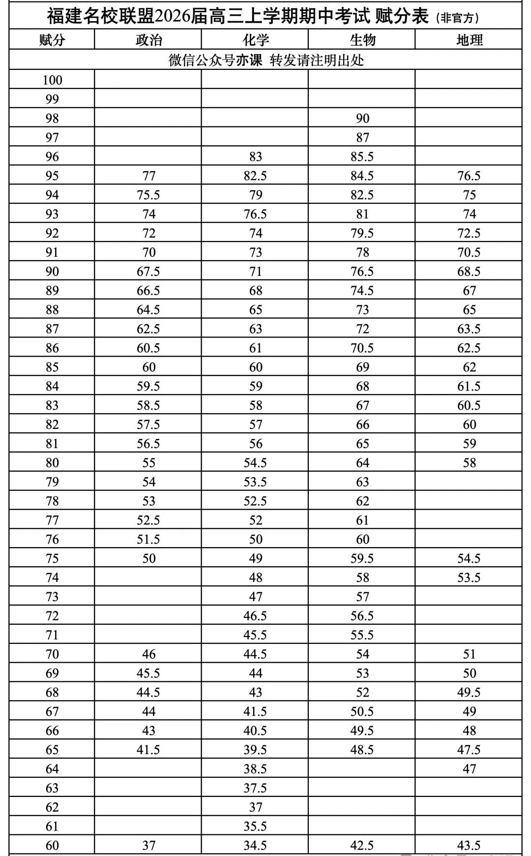 从赋分表具体数据看,生物科目在60-80分段赋分平稳,而政治、化学在同等赋分下需更高原始分。例如,赋分80分时,生物需原始分64分,政治需55分,化学需54.5分,地理需58分。这反映出生物和地理的赋分“性价比”更高。