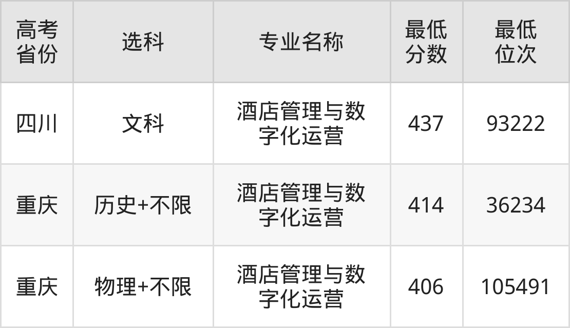 重庆航天职业技术学院酒店管理与数字化运营专业2024年在四川的最低分是437分、在重庆的最低分是406分。