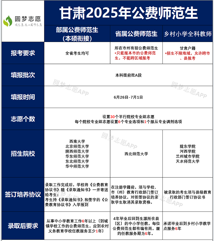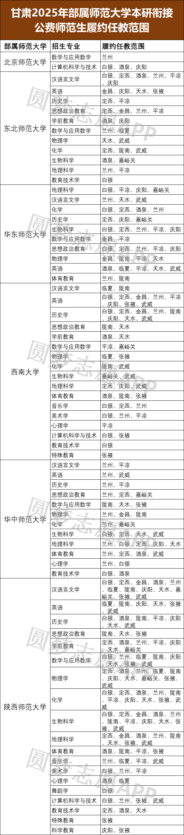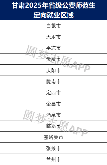 以下为2025年甘肃省级公费师范生定向就业市州整理: