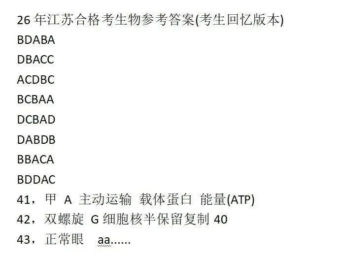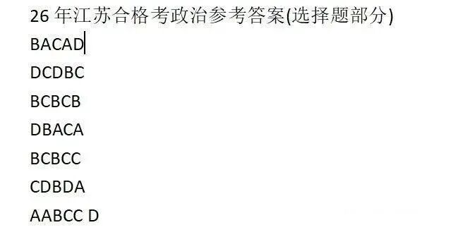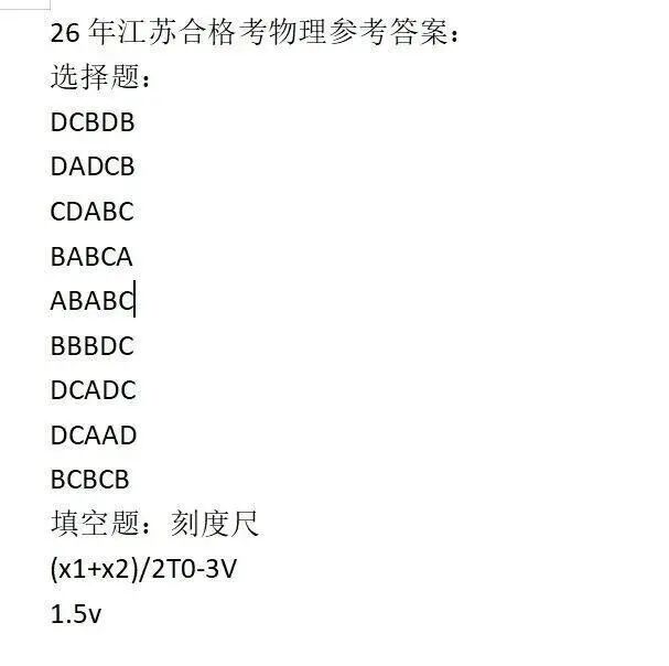 根据江苏省往年安排,2026年合格考成绩预计将于2026年2月下旬公布,考生可通过江苏省教育考试院官网查询。为帮助考生提前预估成绩,本文汇总了各科目回忆版参考答案,供大家对照参考。请务必注意,以下答案非官方标准答案,最终成绩请以考试院公布为准。