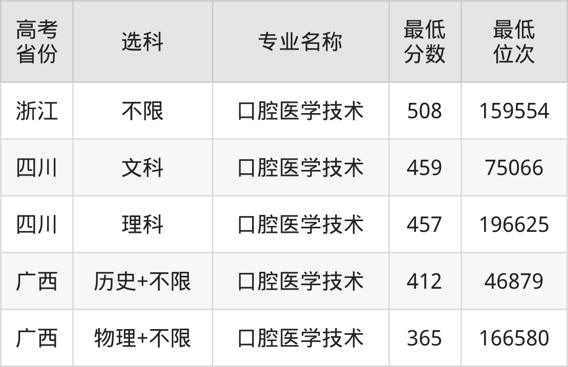 安徽中医药高等专科学校口腔医学技术专业2024年在浙江的最低分是508分、在四川的最低分是457分、在广西的最低分是365分。