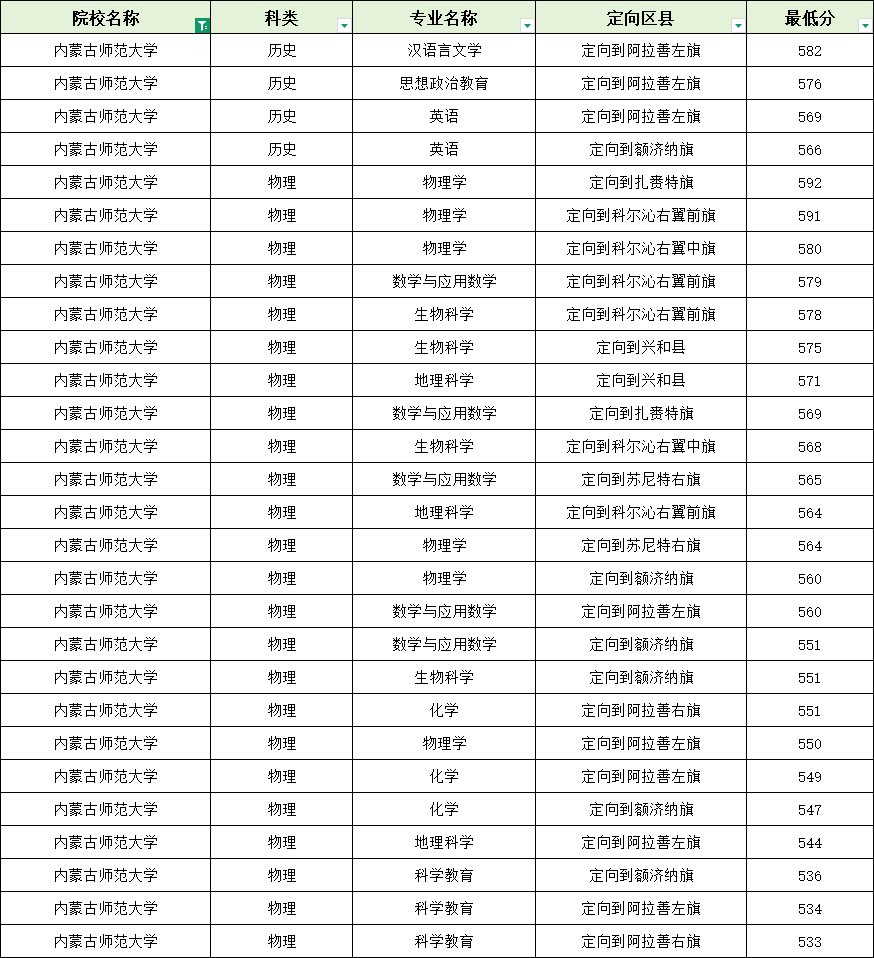 整体来看,内蒙古师范类高校定向区县录取差距明显,历史类中汉语言文学、思想政治教育和英语专业竞争较为激烈;物理类中物理学和数学与应用数学专业分数普遍较高,科学教育等专业相对较低。