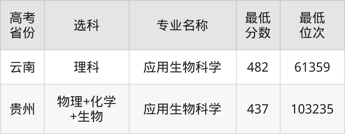 贵州师范学院应用生物科学专业2024年在云南的最低分是482分、在贵州的最低分是437分。