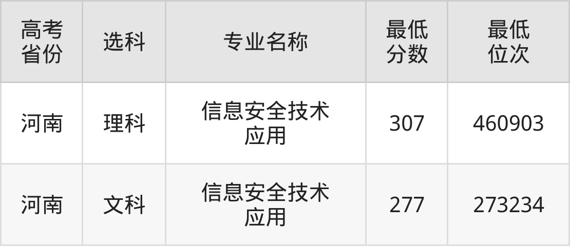 | 高考 省份 | 选科 | 专业 名称 | 最低 分数 | 最低 位次 |