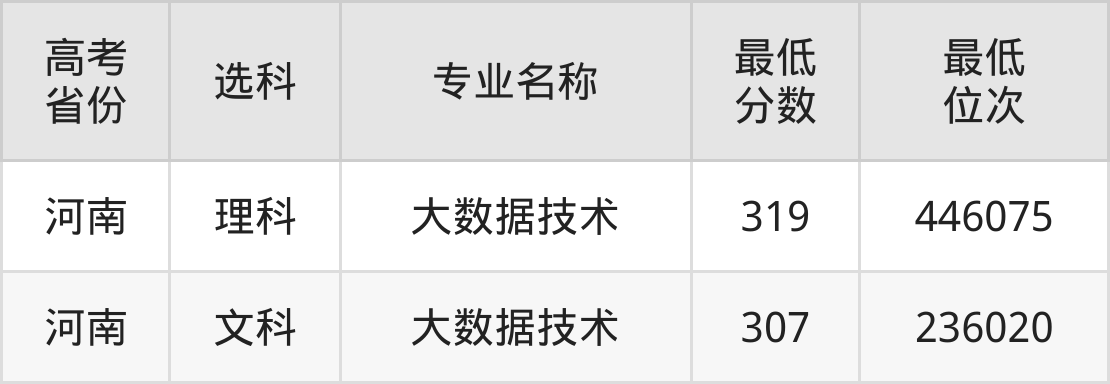 | 河南 | 文科 | 建筑工程技术 | 308 | 234756 |