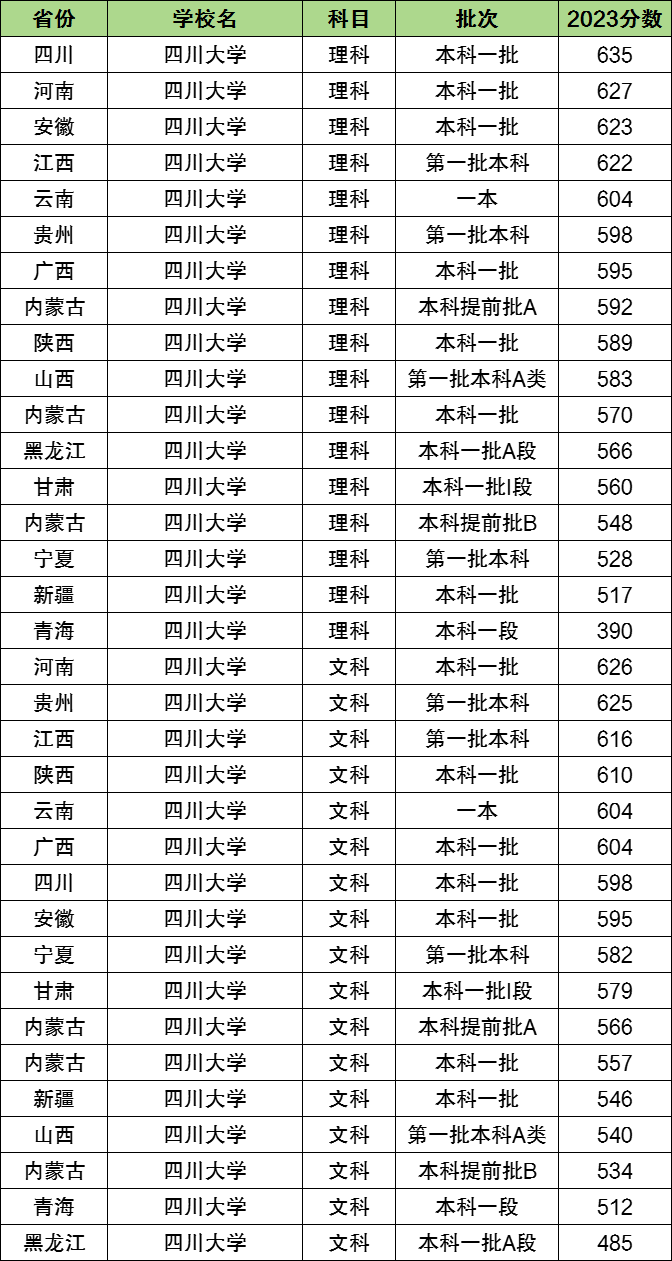 可以看到,2023年四川大学在旧高考文理省份的理科招生中,录取分数线最高是四川省(635分录取),最低的是青海省(360分录取)。