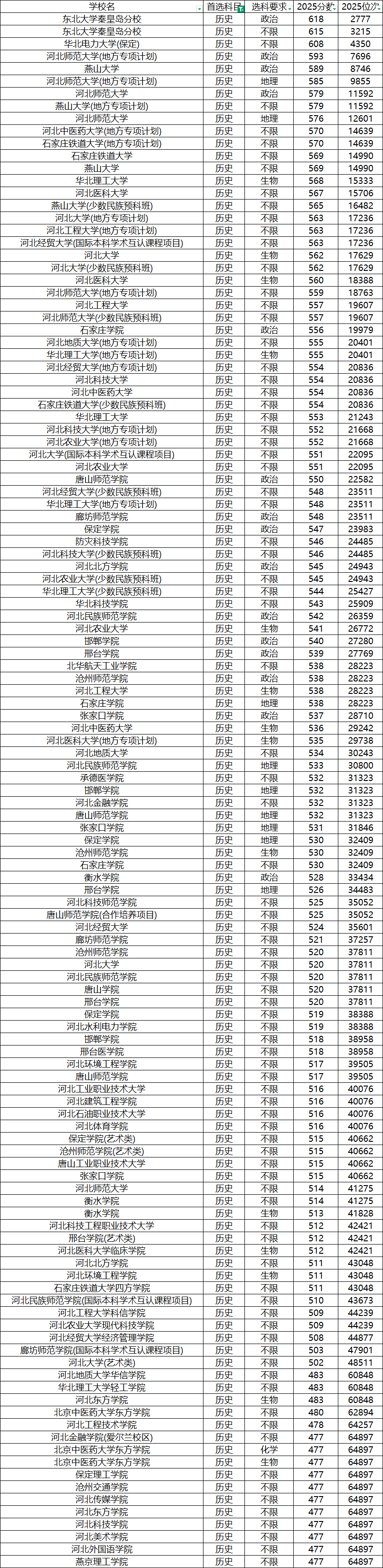 河北工业大学 的历史类普通专业组(不限选科)最低分为 603分,继续位居首位。燕山大学 最低分为 569分,石家庄铁道大学 同为 569分,河北医科大学 为 560分。河北师范大学 为 514分,河北大学 为 520分,华北理工大学 为 553分,河北农业大学 为 541分。可见,师范类和医学类院校在历史类中依然抢手。