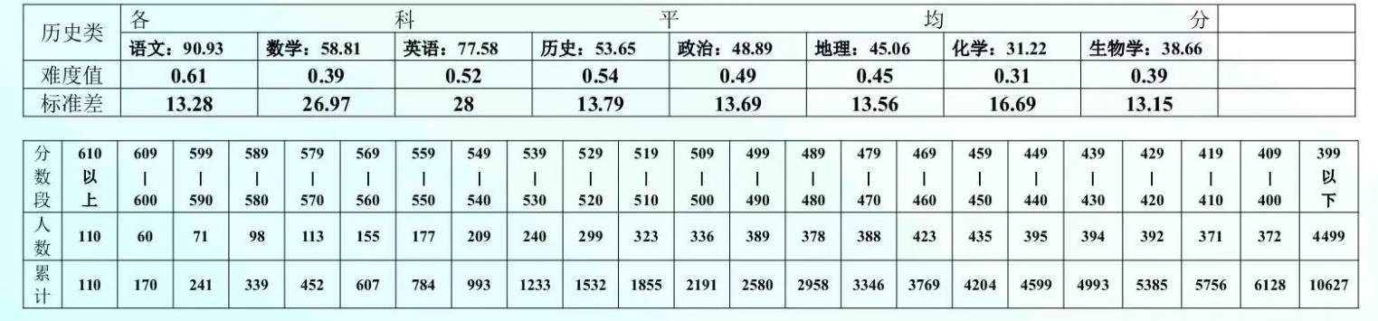 语文90.93分、数学58.81分、英语77.58分、历史53.65分、政治48.89分、地理45.06分、化学31.22分、生物学38.66分。数学平均分偏低且标准差高达26.97,是历史类考生的“拉分王”。
