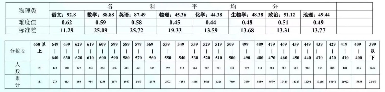 整体难度在0.44-0.62之间,物理、化学难度相对较高,政治、地理相对平稳。