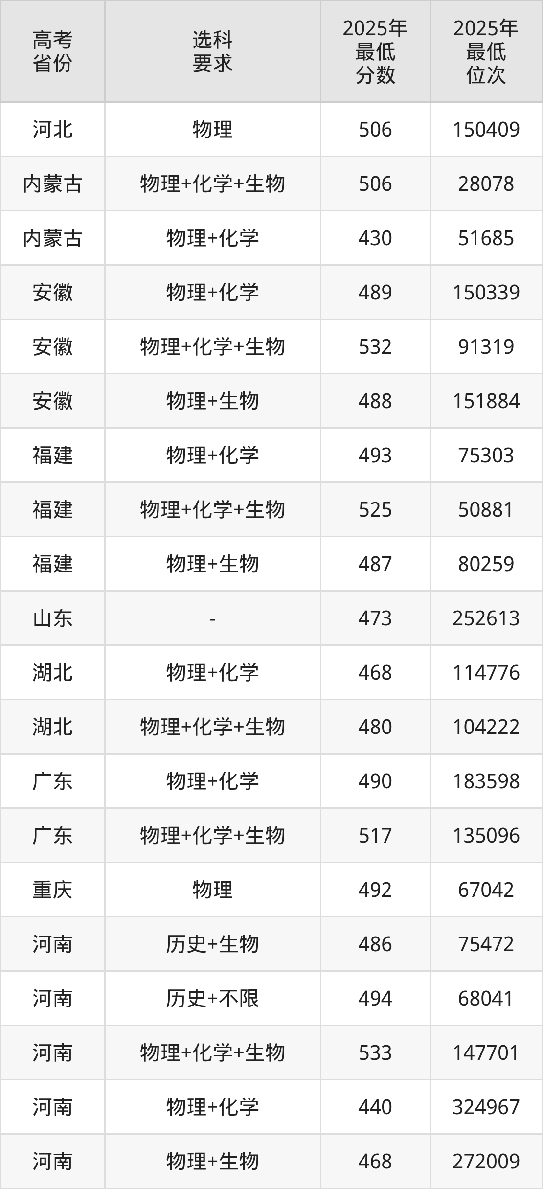 在2025年河南高考物理类招生时,公办本科收分最低的是福建商学院第801组(预科组),最低分是423分、位次是355229位。再看豫北医学院,2025年在河南物理类的最低录取分数线是428分,最低位次是346607位。