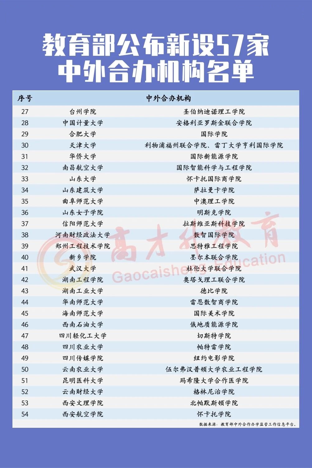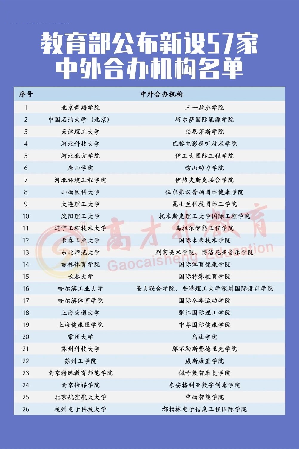以下为教育部公布的57个新设中外合作办学机构名单,涵盖了中国院校与海外合作伙伴: