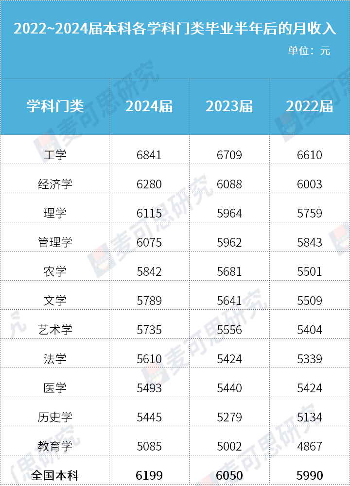 从学科门类看,2022-2024届本科毕业生月收入呈现明显分层: