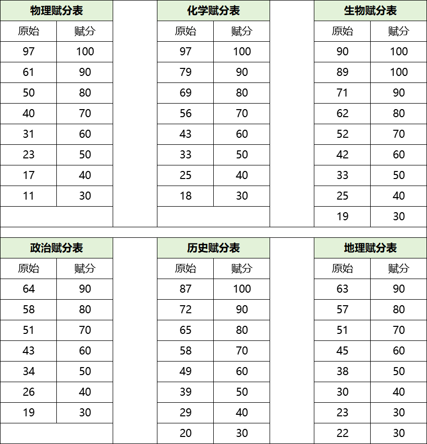 6.地理:原始分63分赋90分,57分赋80分,51分赋70分,45分赋60分,38分赋50分。