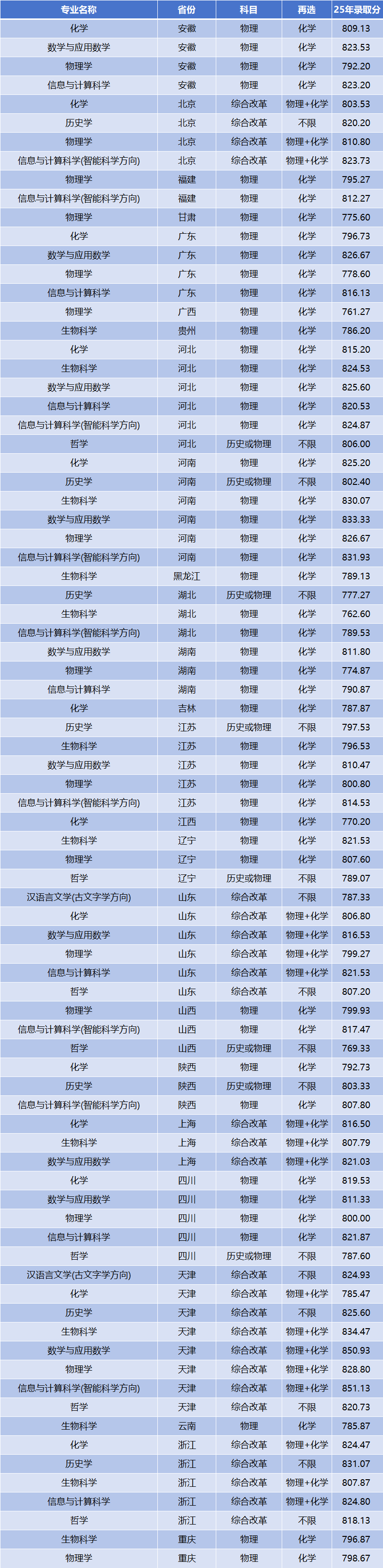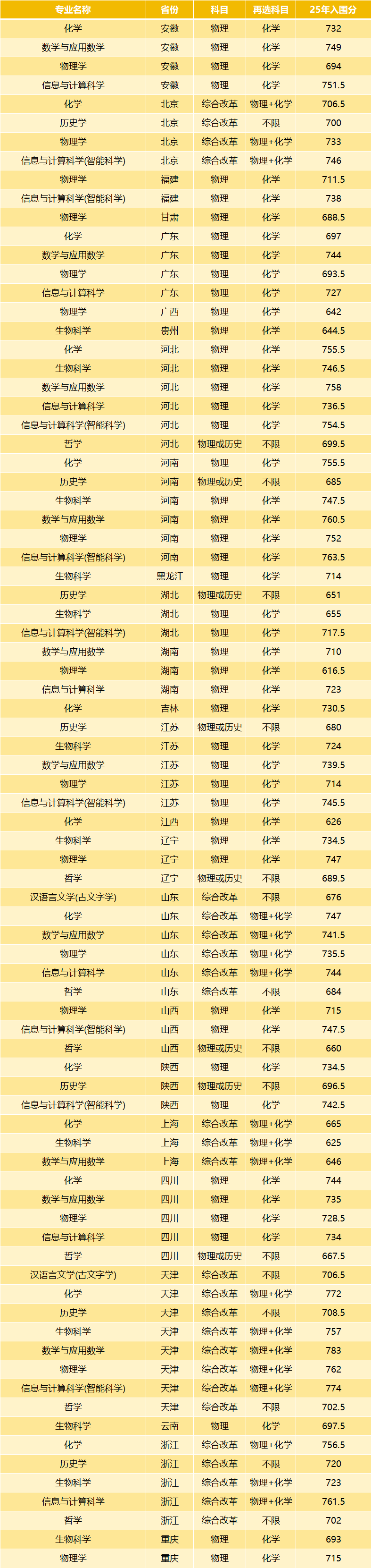 北京:信息与计算科学(智能科学方向)746分,物理学733分,化学706.5分,历史学700分。