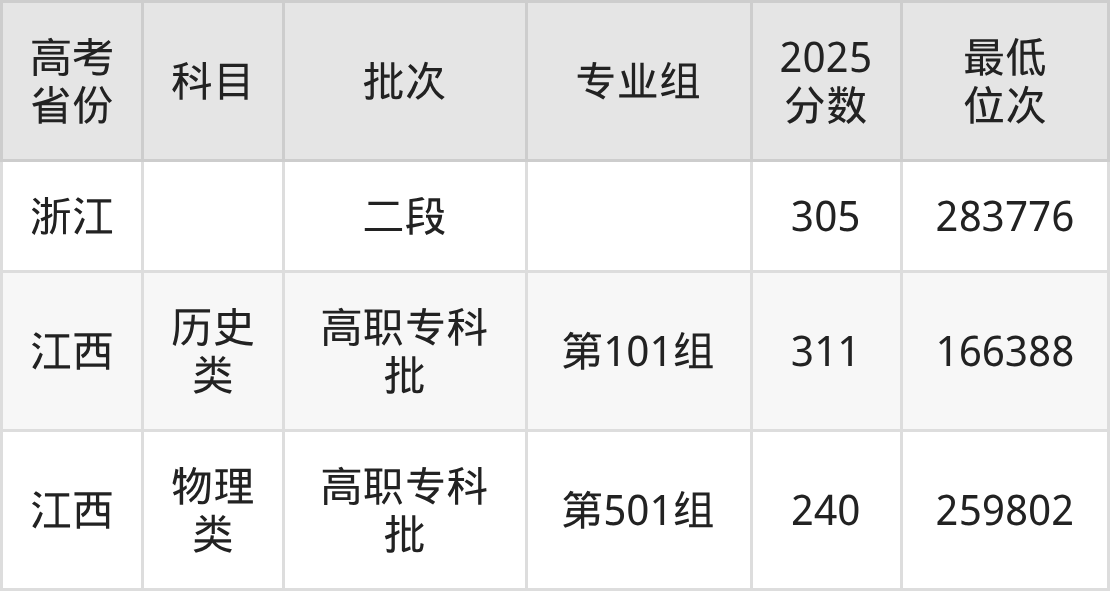 赣东职业技术学院2025年在全国各省的最低分是240分,在江西历史类招生的最低分是311分、最低位次是166388位,在江西物理类招生的最低分是240分、最低位次是259802位,在浙江招生的最低分是305分、最低位次是283776位。