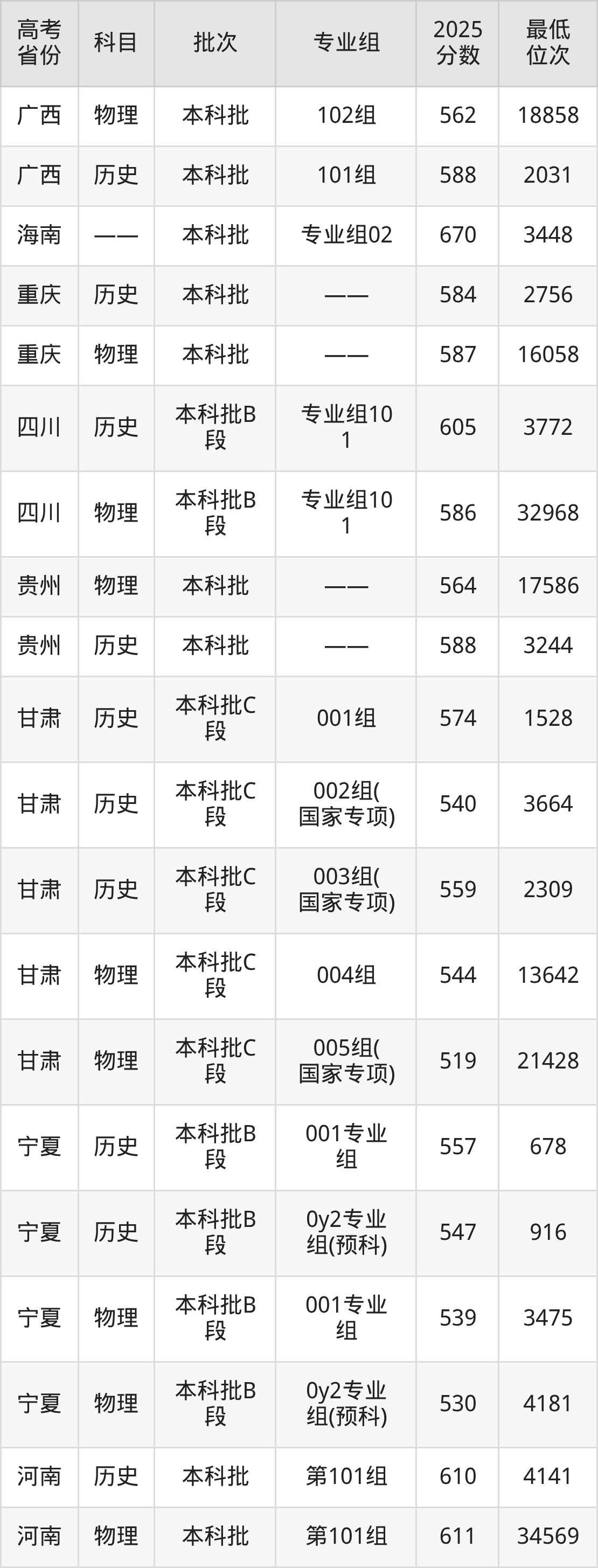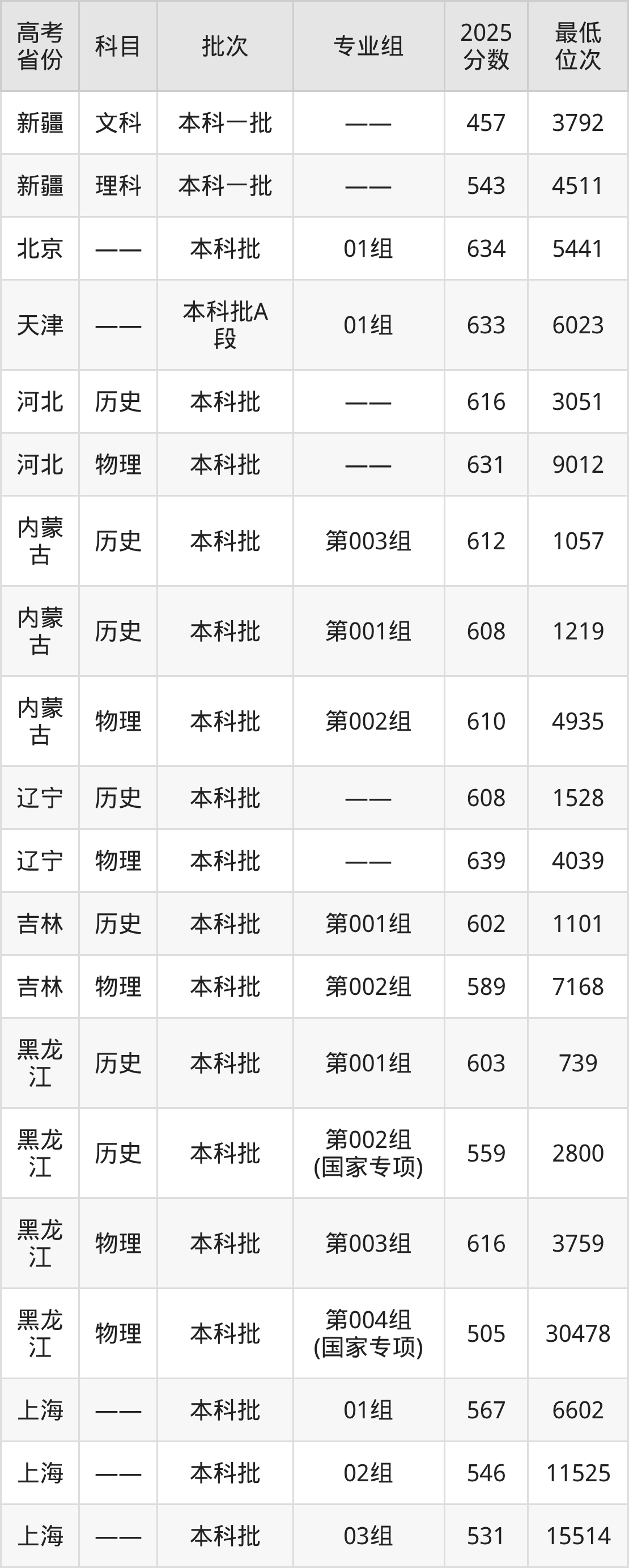 华东政法大学2025年在全国各省的最低分是457分,在上海招生的最低分是531分、最低位次是15514位,在新疆文科招生的最低分是457分、最低位次是3792位,在新疆理科招生的最低分是543分、最低位次是4511位。