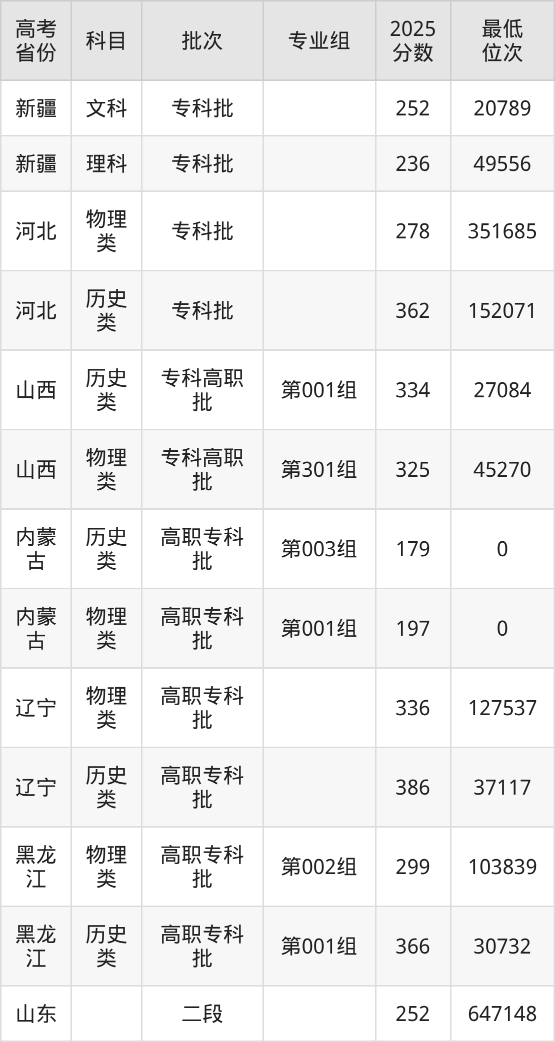 呼伦贝尔职业技术学院2025年在全国各省的最低分是179分,在内蒙古历史类招生的最低分是179分,在内蒙古物理类招生的最低分是197分,在新疆理科招生的最低分是236分、最低位次是49556位。