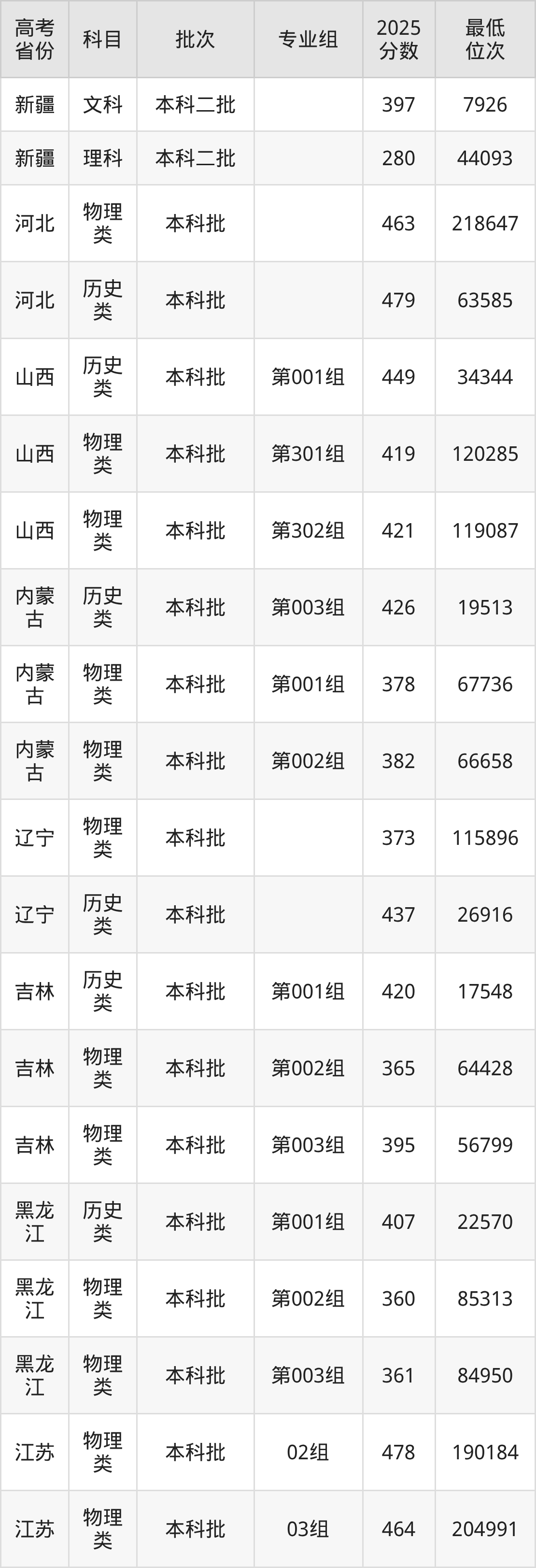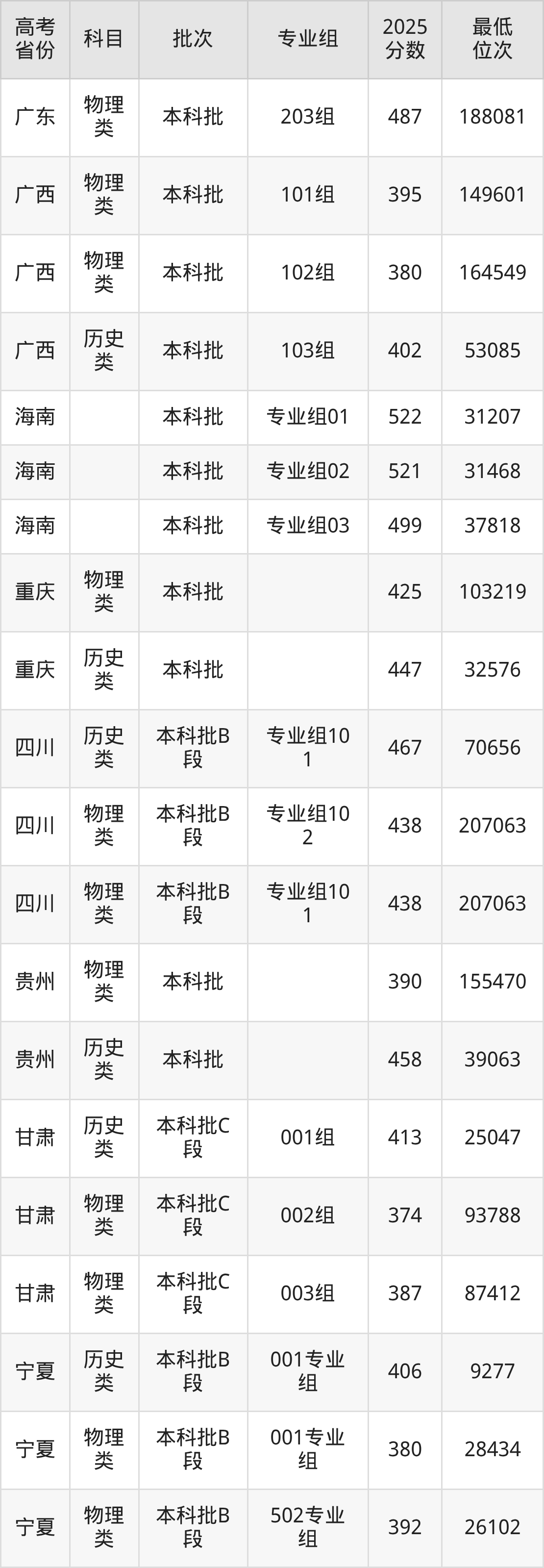 广州城市理工学院2025年在全国各省的最低分是280分,在广东历史类招生的最低分是507分、最低位次是52460位,在广东物理类招生的最低分是487分、最低位次是188614位,在新疆文科招生的最低分是397分、最低位次是7926位。