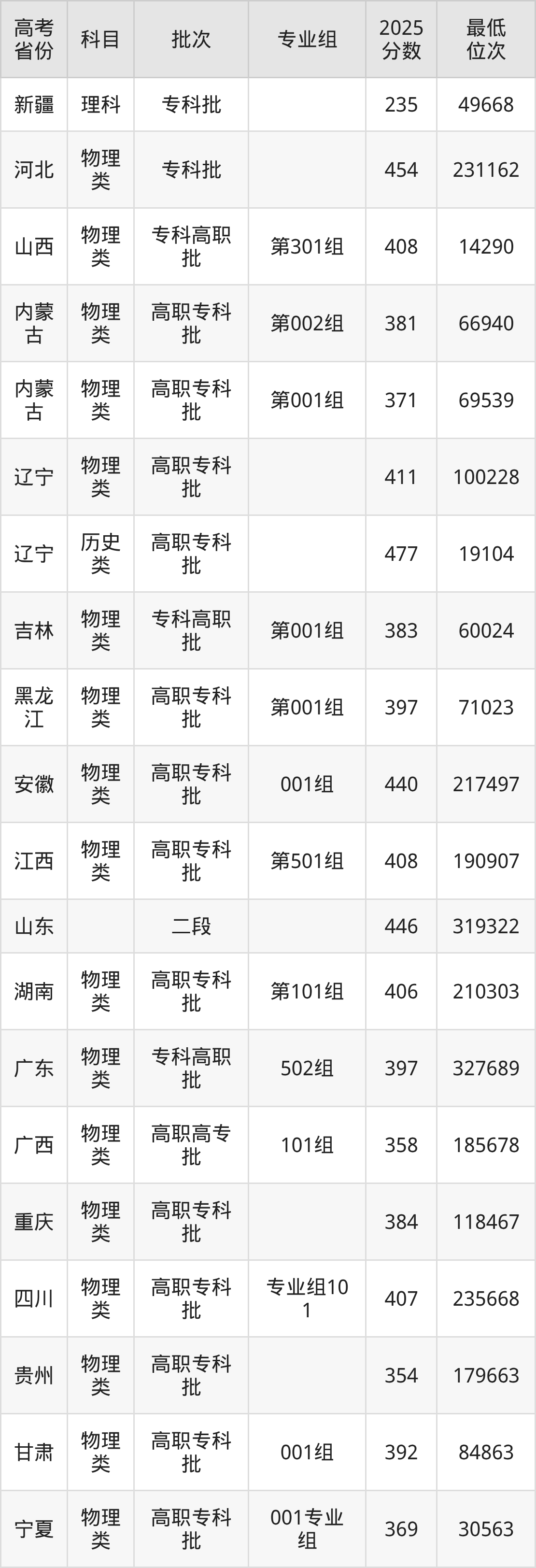 辽宁铁道职业技术学院2025年在全国各省的最低分是235分,在辽宁物理类招生的最低分是411分、最低位次是100228位,在辽宁历史类招生的最低分是477分、最低位次是19104位,在新疆理科招生的最低分是235分、最低位次是49668位。