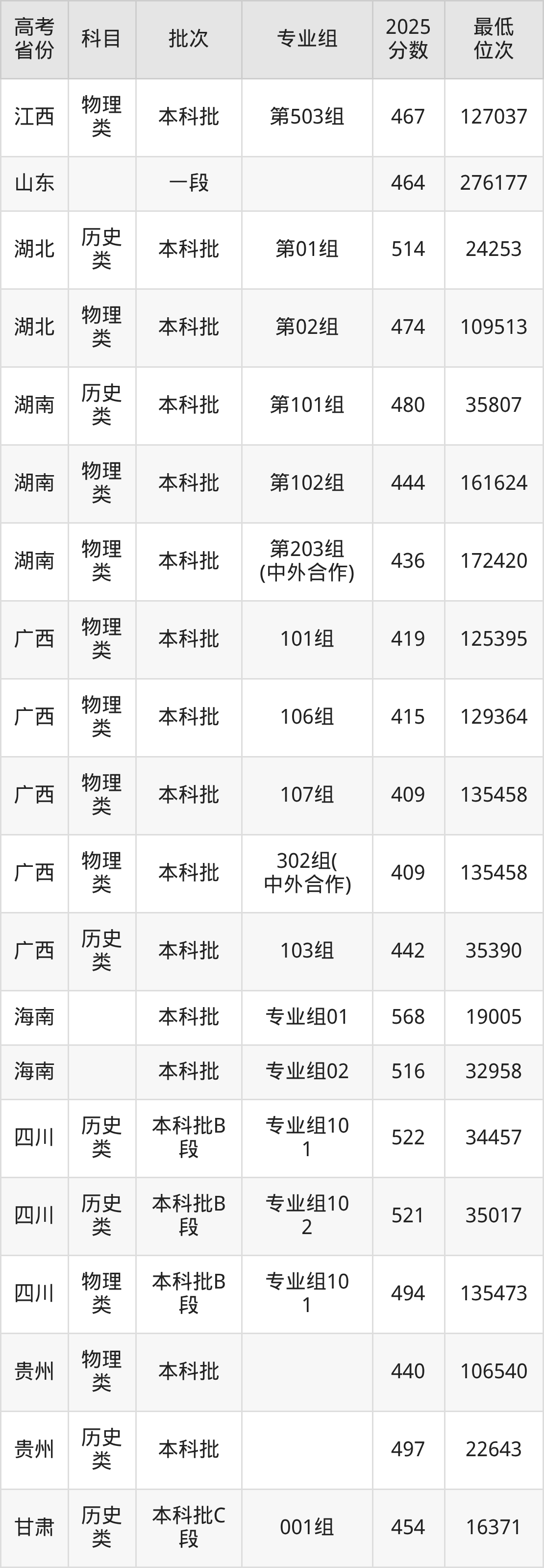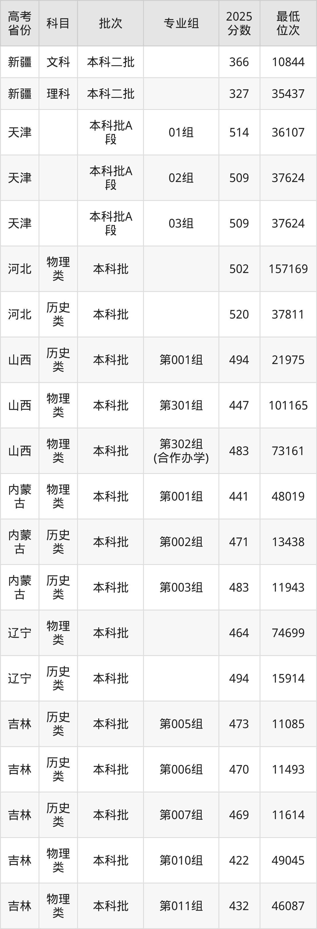 吉林工程技术师范学院2025年在全国各省的最低分是327分,在吉林历史类招生的最低分是469分、最低位次是11614位,在吉林物理类招生的最低分是415分、最低位次是51093位,在新疆文科招生的最低分是366分、最低位次是10844位。