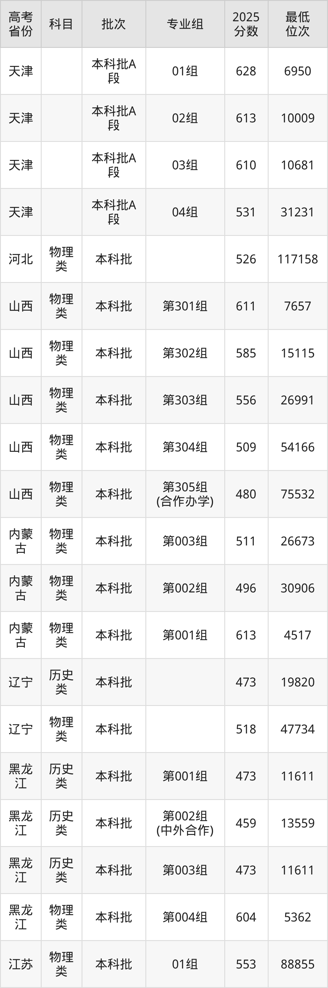 | 学校 代码 | 科目 | 2025年 专业组 | 专业 代码 | 2025年 专业名称 | 收费 标准 |