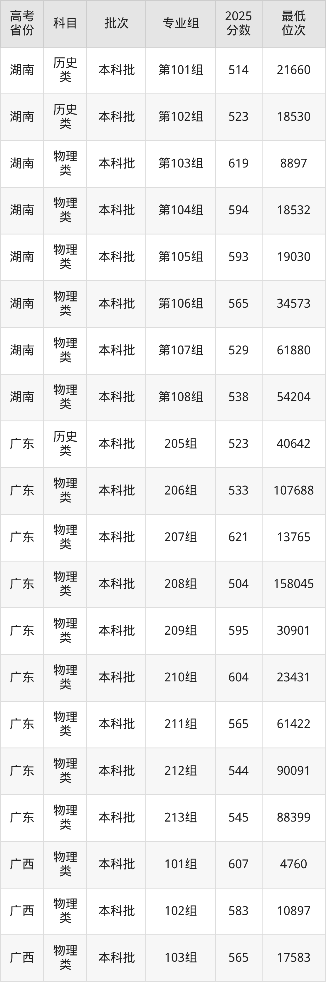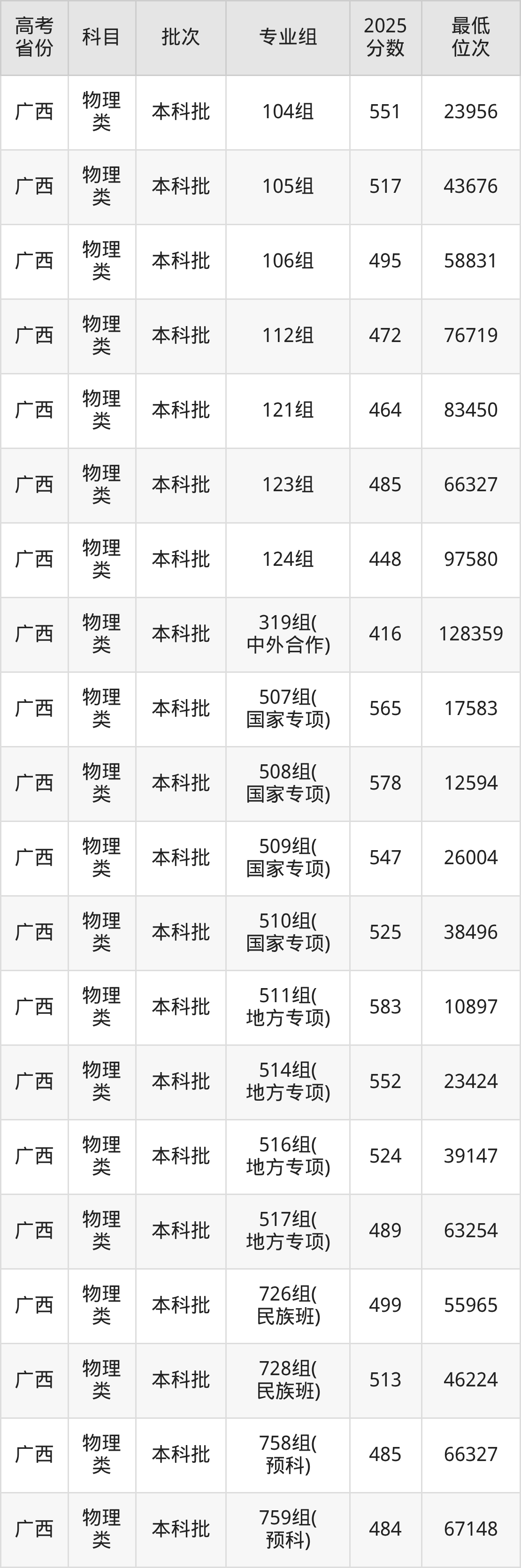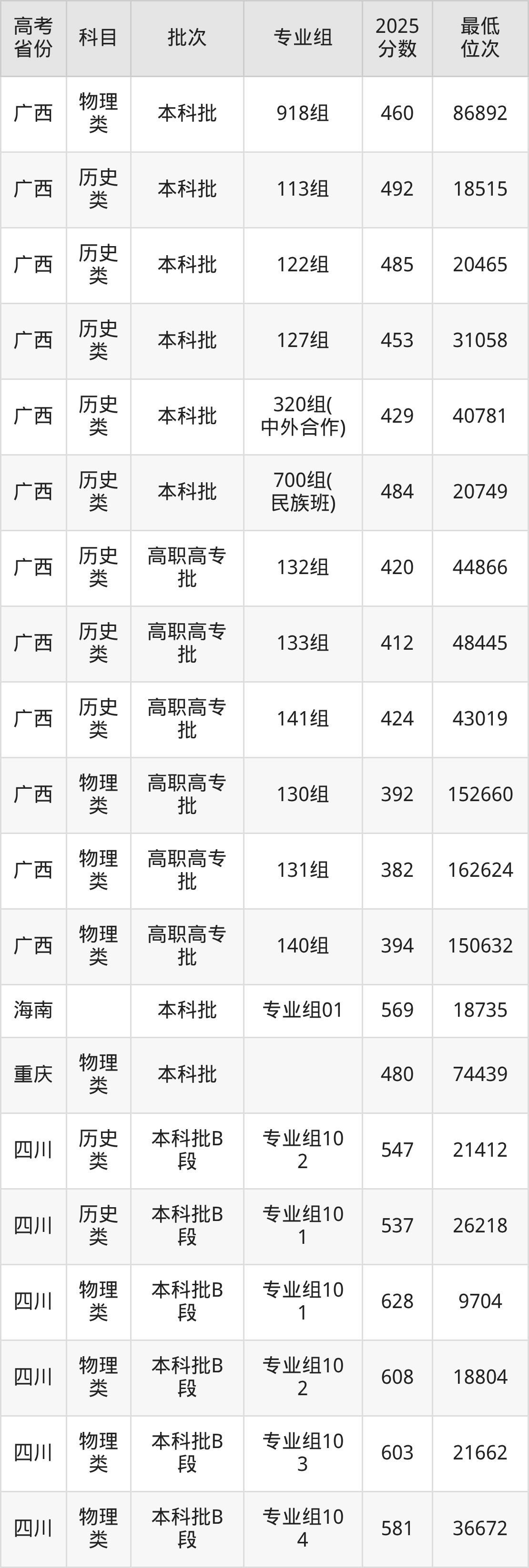 2026届高考生请重点参考下表,若你的高考成绩超过了广西医科大学往年在你省的最低录取分及位次,那么2026年被录取的概率也会比较高: