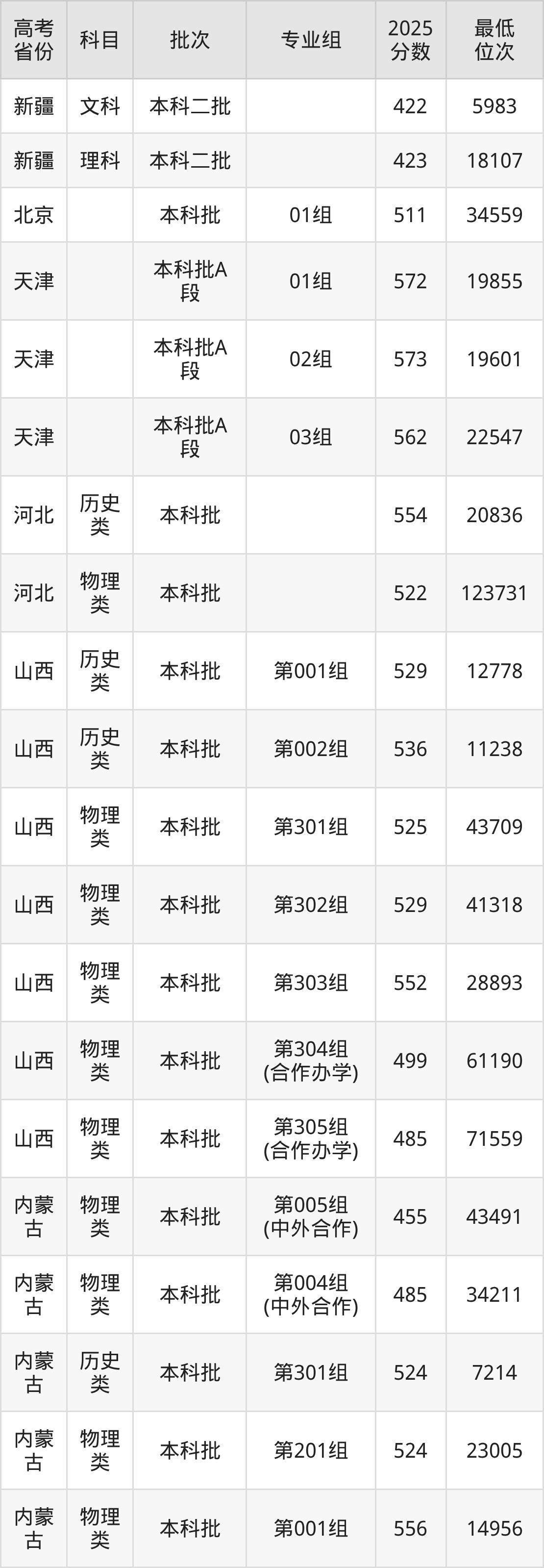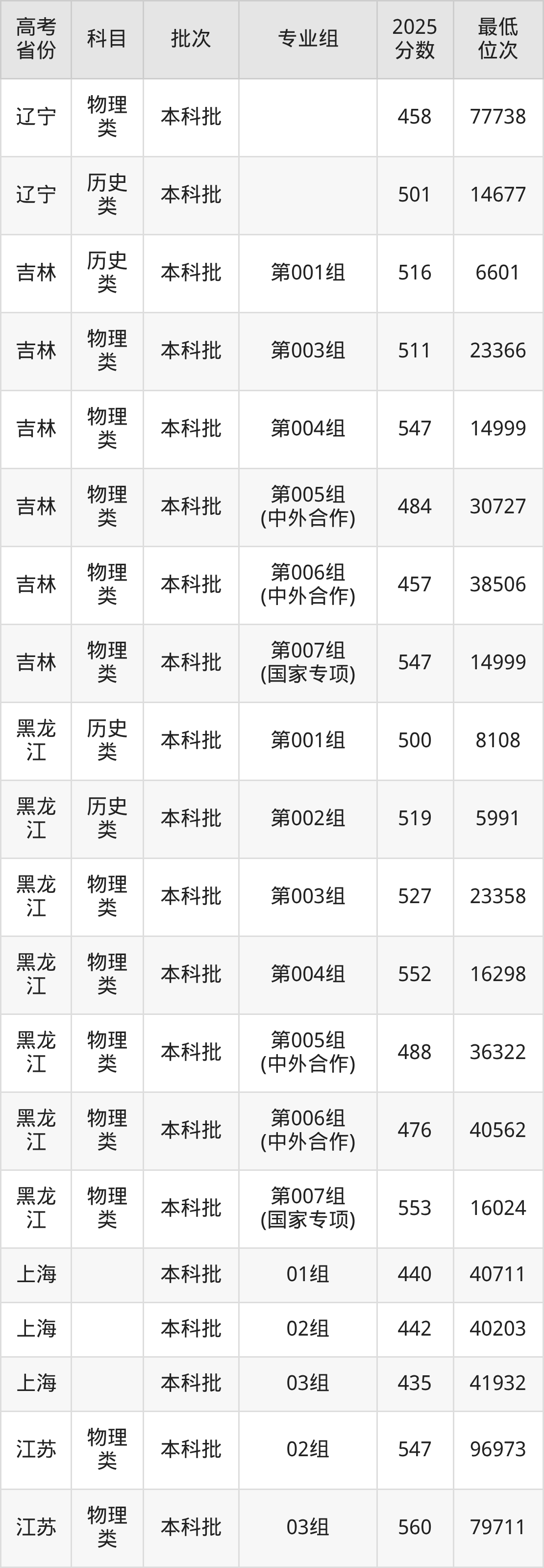 沈阳理工大学2025年在全国各省的最低分是390分,在辽宁物理类招生的最低分是458分、最低位次是77738位,在辽宁历史类招生的最低分是501分、最低位次是14677位,在新疆理科招生的最低分是423分、最低位次是18107位。