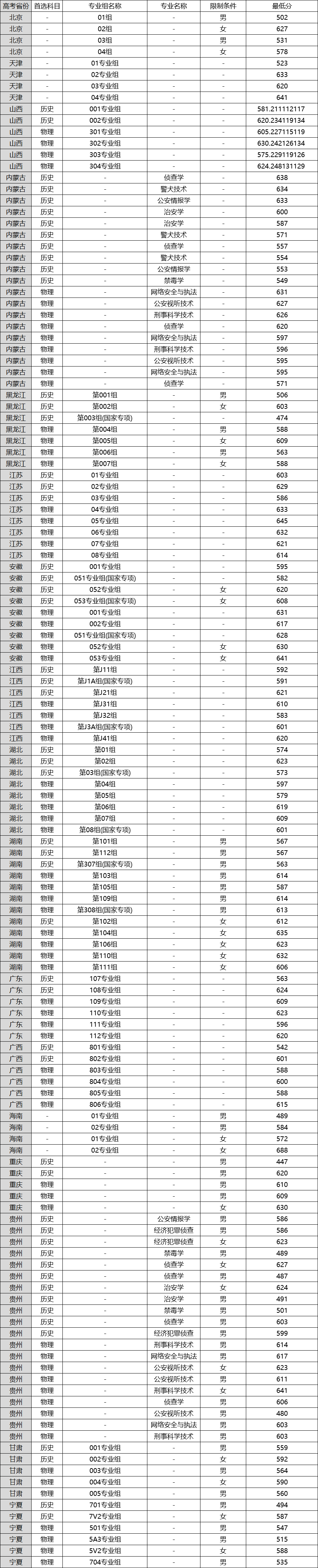 中国刑事警察学院2025年在全国各省的录取分数线一览表具体如下: