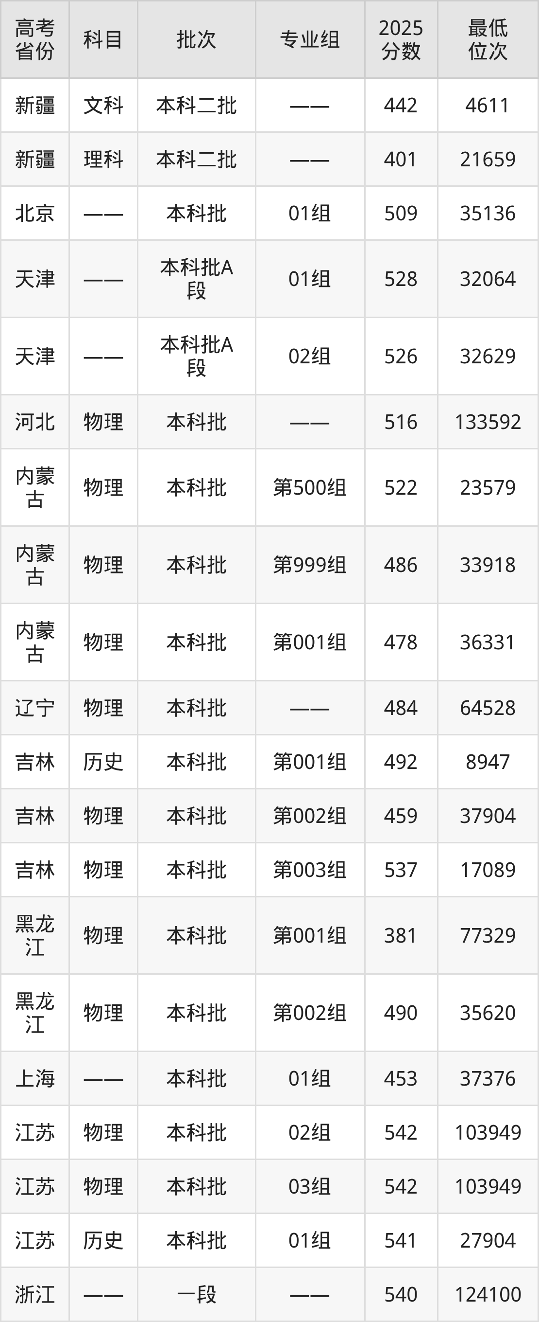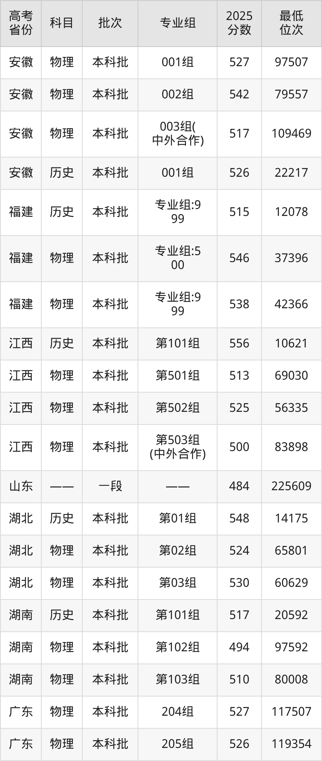 | 1030 | 物理 | 专业组: 999 | 046 | 审计学 | 5460 |