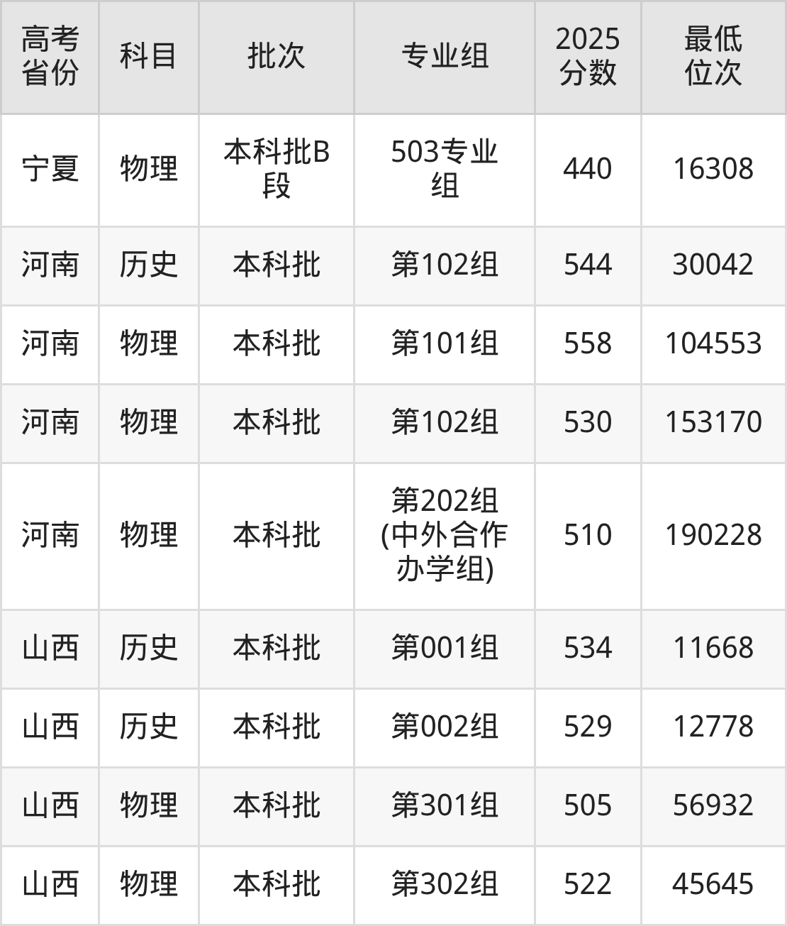 | 1030 | 物理 | 专业组: 999 | 044 | 工程造价 | 5460 |