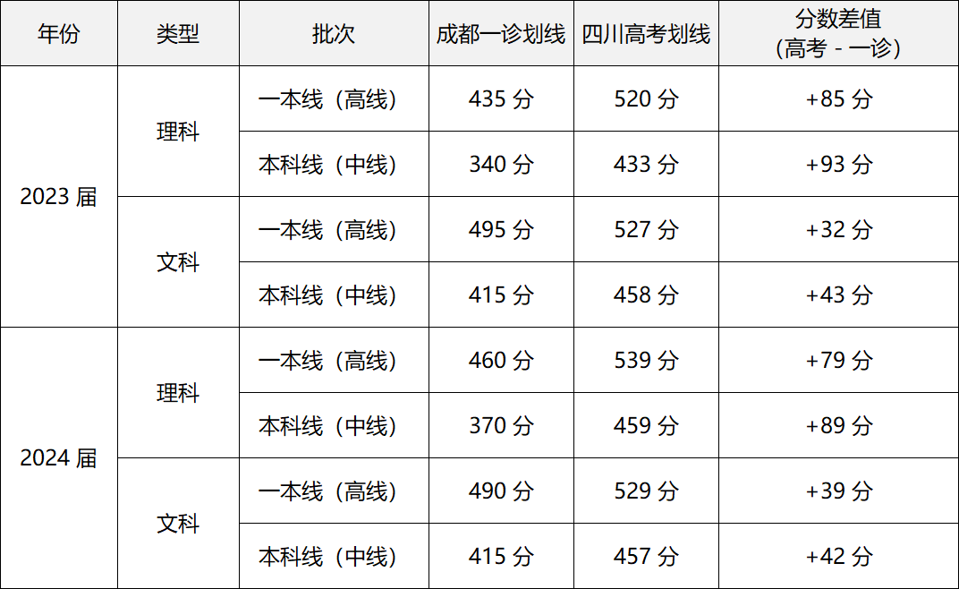 以下为2023届、2024届成都一诊划线(文科/理科)与当年四川高考划线的详细对比及分数差值(高考分数减去一诊分数)。请注意,2025届因成都参与八省联考,未组织统一的一诊考试,故此处主要参考前两年数据。