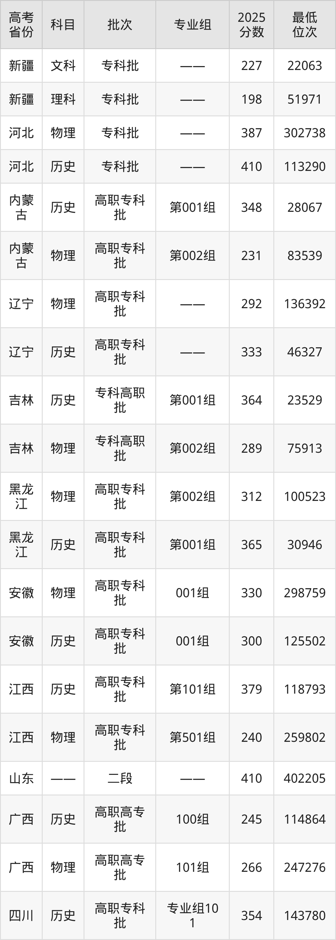 辽宁生态工程职业学院2025年在全国各省的最低分是198分,在辽宁物理类招生的最低分是292分、最低位次是136392位,在辽宁历史类招生的最低分是333分、最低位次是46327位,在新疆文科招生的最低分是227分、最低位次是22063位。