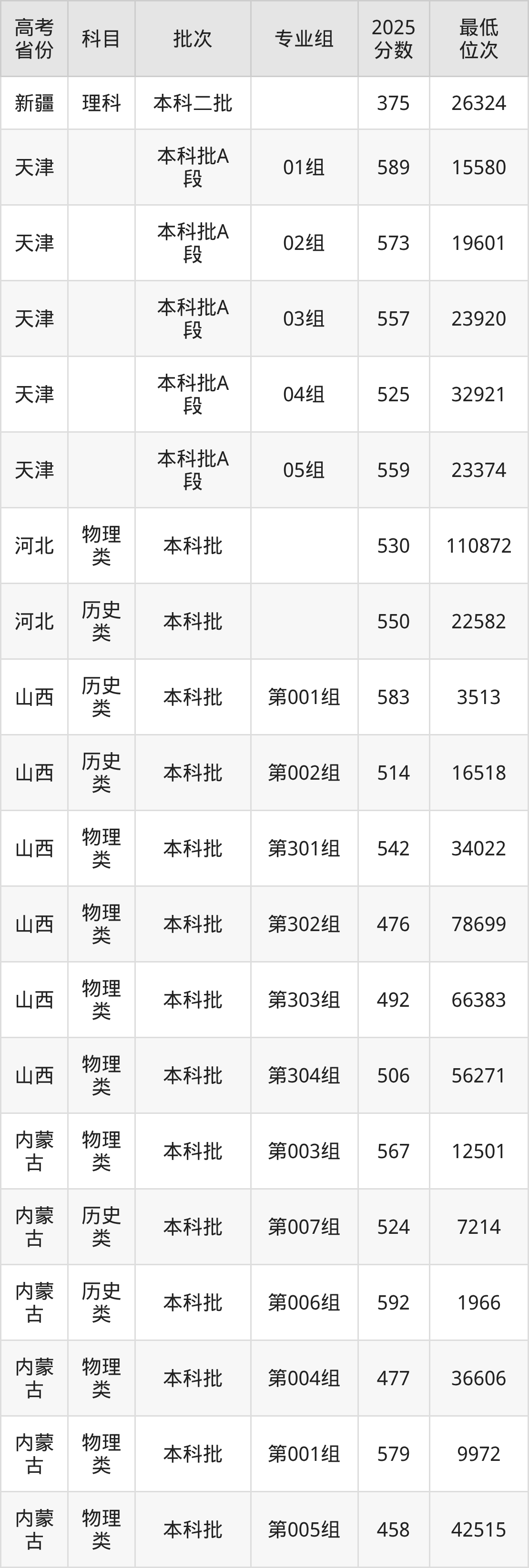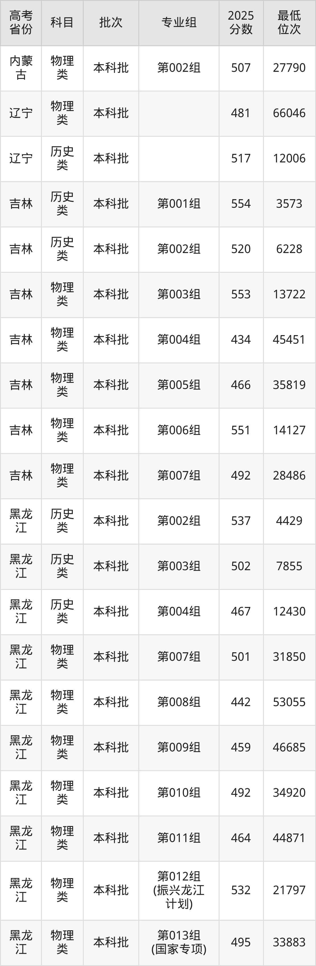 黑龙江中医药大学2025年在全国各省的最低分是375分,在黑龙江历史类招生的最低分是467分、最低位次是12430位,在黑龙江物理类招生的最低分是442分、最低位次是53055位,在新疆理科招生的最低分是375分、最低位次是26324位。