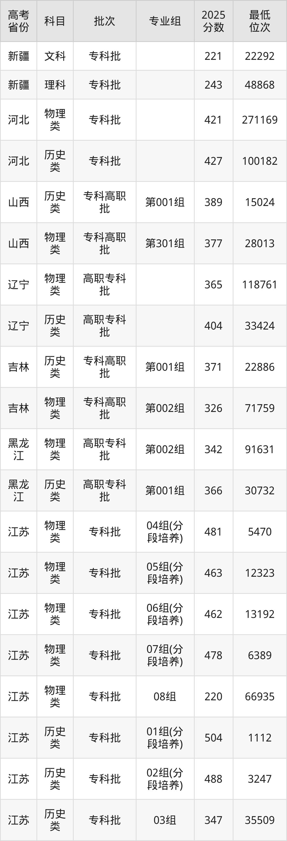 江苏旅游职业学院2025年在全国各省的最低分是220分,在江苏物理类招生的最低分是220分、最低位次是66935位,在江苏历史类招生的最低分是347分、最低位次是35509位,在新疆文科招生的最低分是221分、最低位次是22292位。