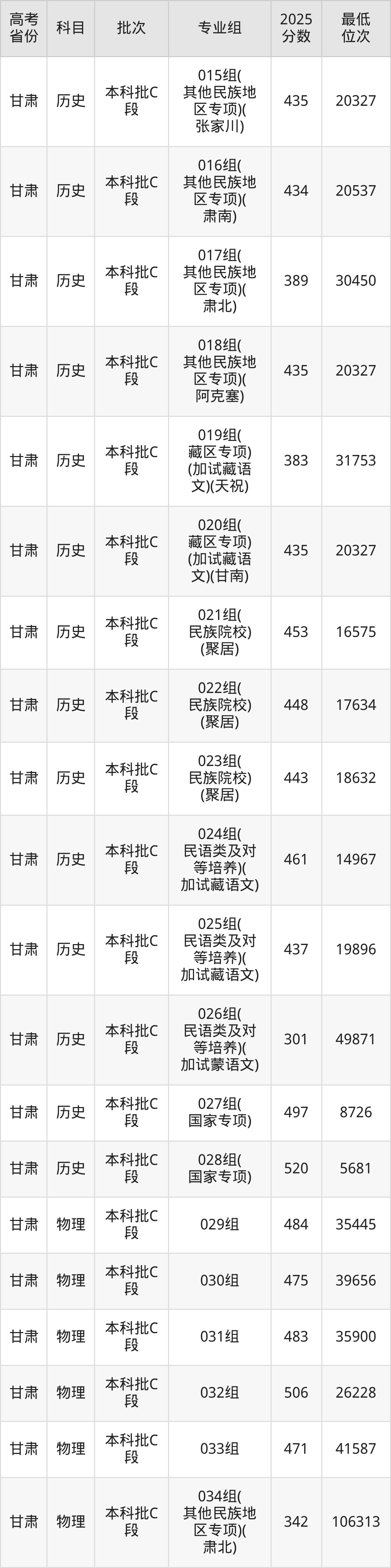 西北民族大学2025年在全国各省的最低分是301分,在甘肃历史类招生的最低分是301分、最低位次是49871位,在甘肃物理类招生的最低分是337分、最低位次是107834位,在新疆文科招生的最低分是404分、最低位次是7359位。