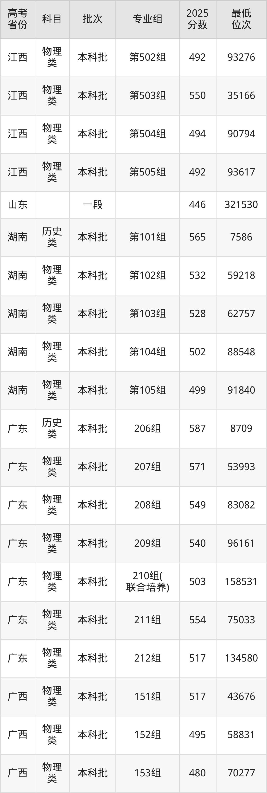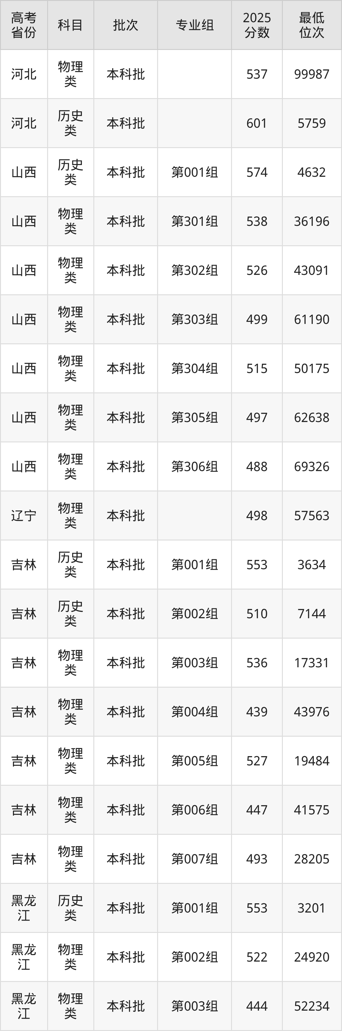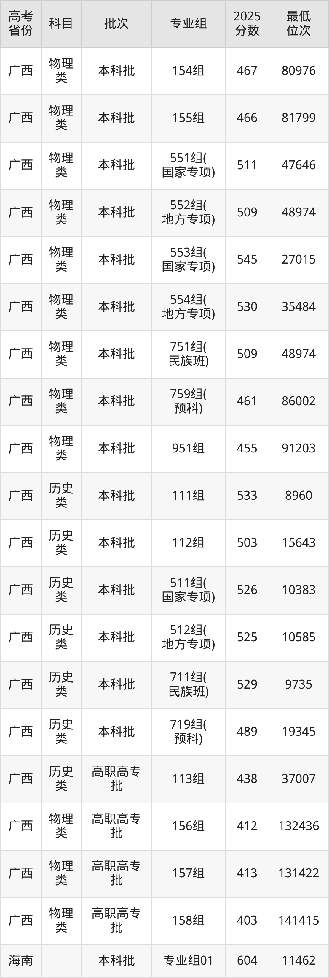 广西中医药大学2025年在全国各省的最低分是403分,在广西物理类招生的最低分是403分、最低位次是141415位,在广西历史类招生的最低分是438分、最低位次是37007位,在河北物理类招生的最低分是537分、最低位次是99987位。