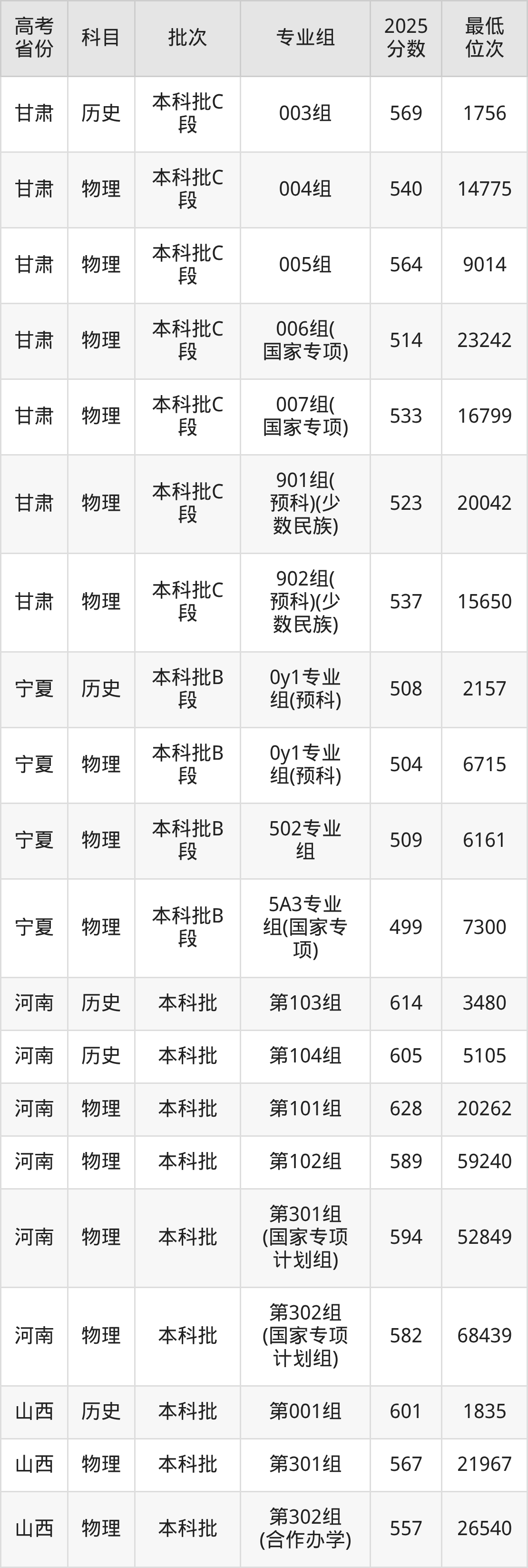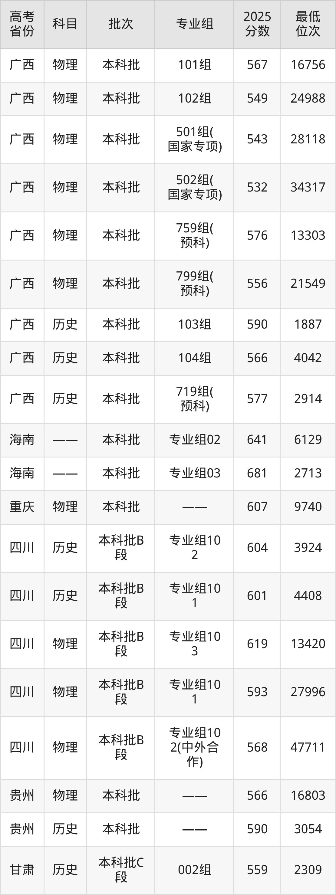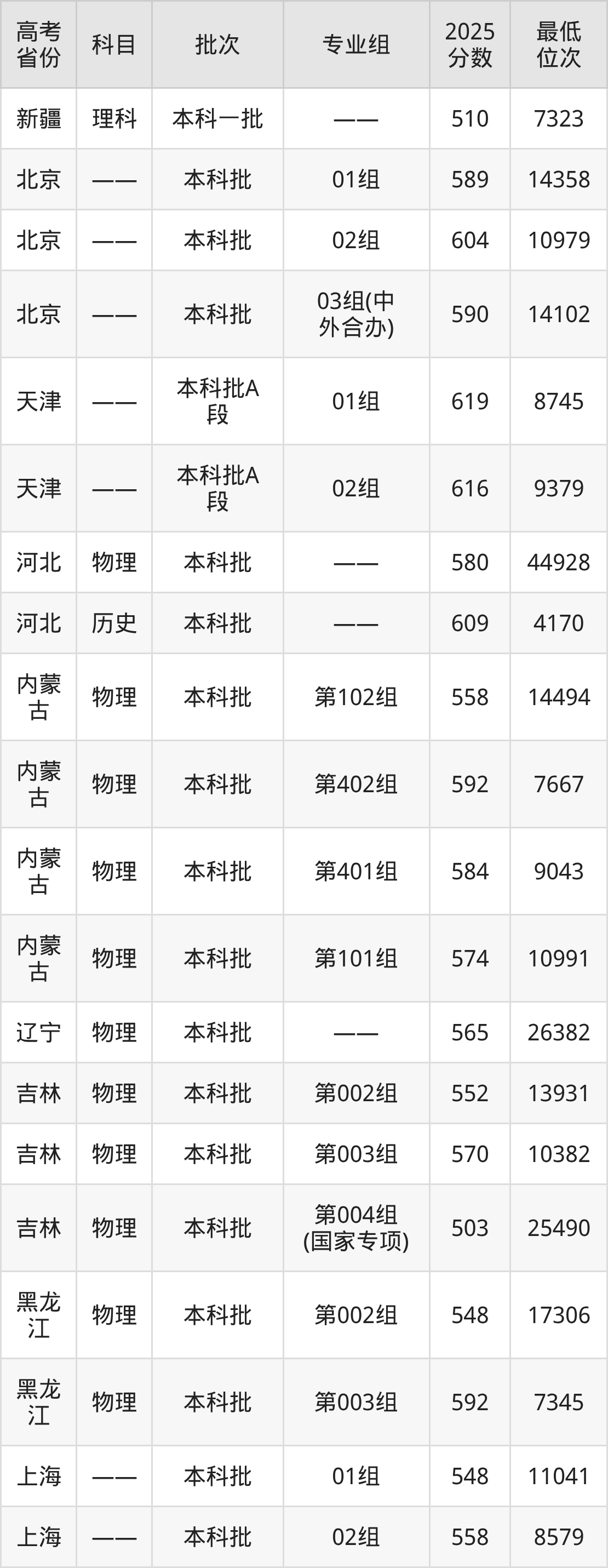合肥工业大学2025年在全国各省的最低分是499分,在安徽物理类招生的最低分是592分、最低位次是32176位,在安徽历史类招生的最低分是591分、最低位次是4693位,在新疆理科招生的最低分是510分、最低位次是7323位。