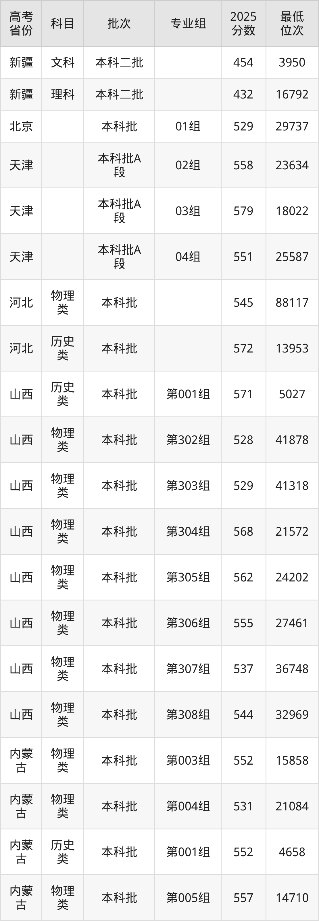 | 1111 | 历史 类 | 专业组: 999 | 020 | 英语 | 5460 |