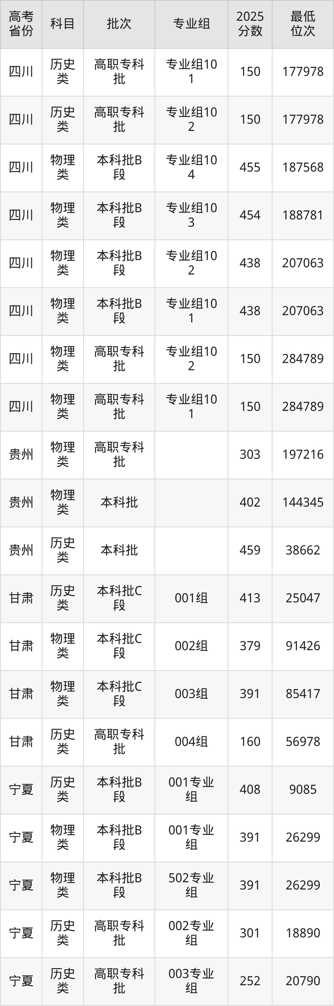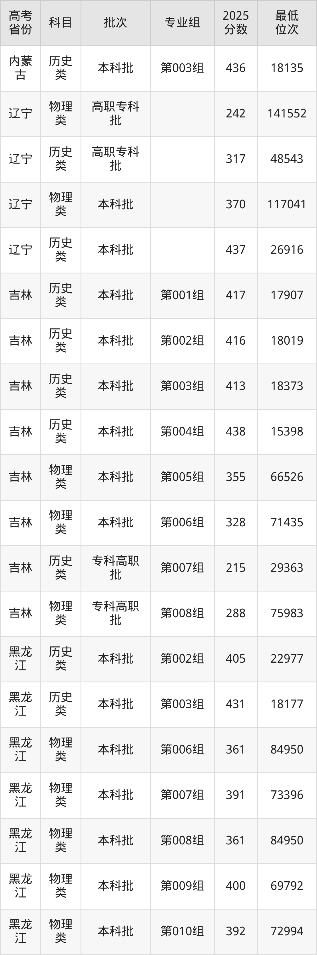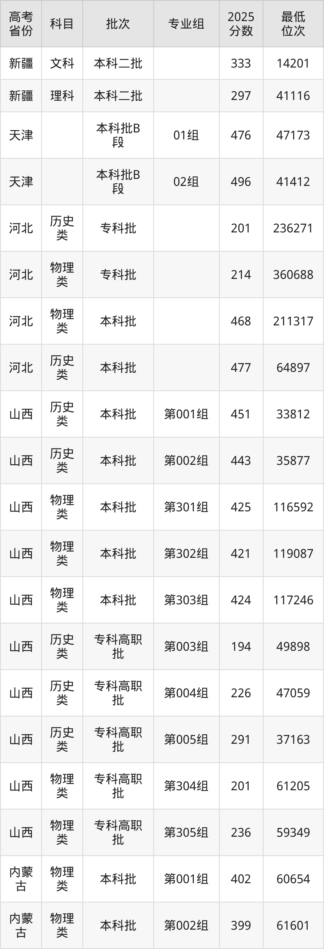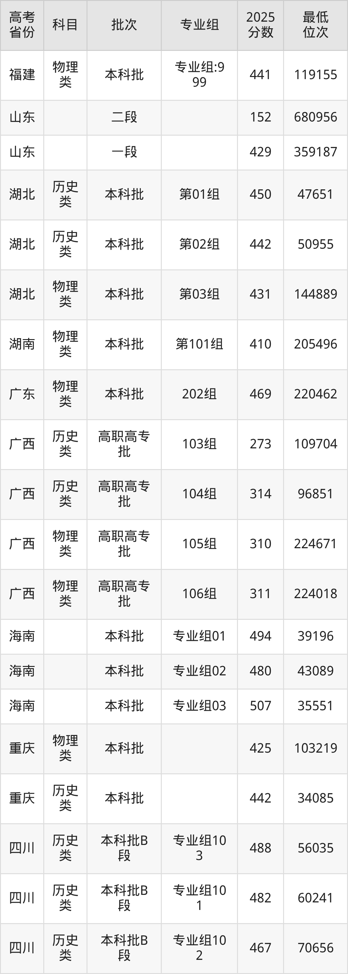 山东英才学院2025年在全国各省的最低分是150分,在山东招生的最低分是152分、最低位次是680956位,在新疆文科招生的最低分是333分、最低位次是14201位,在新疆理科招生的最低分是297分、最低位次是41116位。