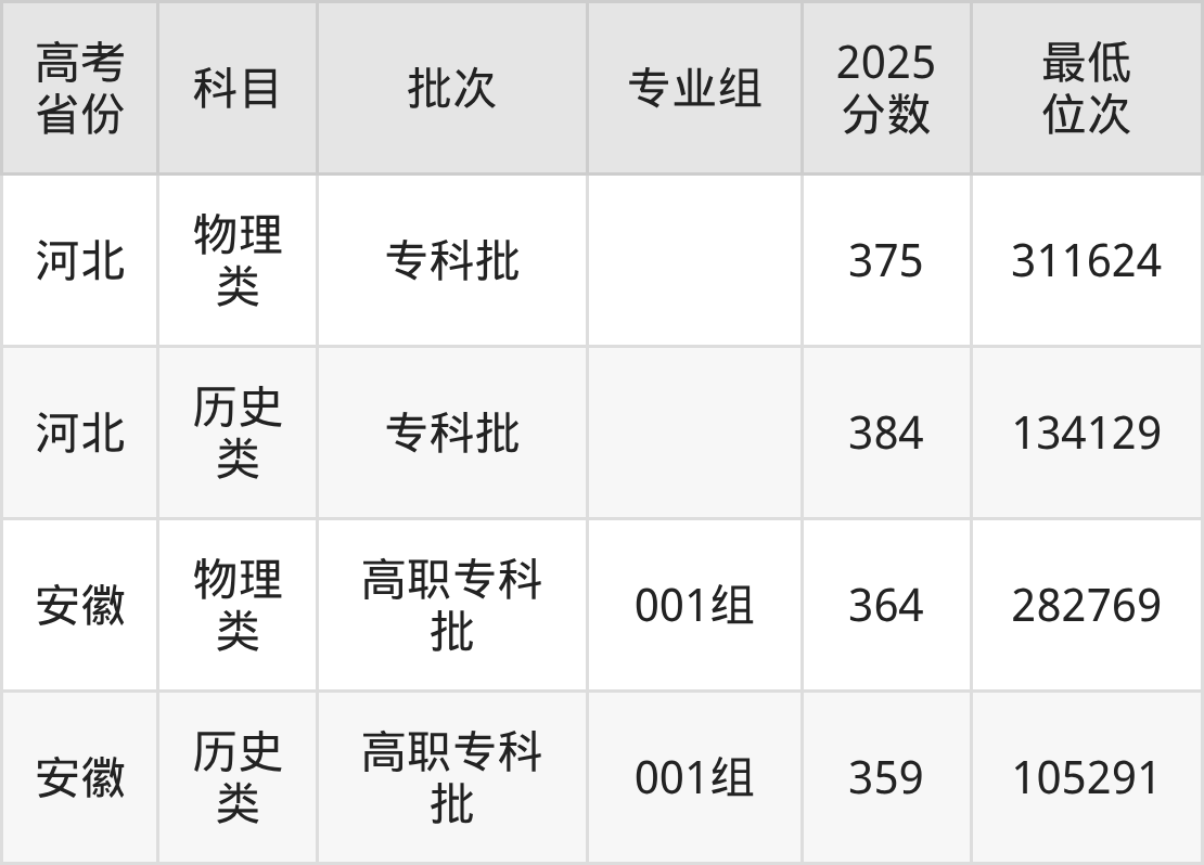 安徽工贸职业技术学院2025年在全国各省的最低分是359分,在安徽物理类招生的最低分是364分、最低位次是282769位,在安徽历史类招生的最低分是359分、最低位次是105291位,在河北物理类招生的最低分是375分、最低位次是311624位。